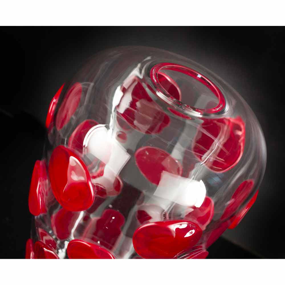 Elegante Vase für Innenräume aus transparentem mundgeblasenem Muranoglas mit runden Details in leuchtendem Rot, die vollständig in Italien hergestellt werden . Eine Ergänzung, die die extreme Eleganz von Muranoglas und seine wunderbaren Eigenschaften mit einem modernen und lebendigen Design kombiniert, um eine Idee von exklusiven und avantgardistischen Möbeln zum Leben zu erwecken, die jeden Wohnraum bereichern können und nicht mit einem Hauch von Farbe . Ein idealer Stil für die unterschiedlichsten Umgebungen, von der Wohnungseinrichtung bis hin zu Hotels, Restaurants, Objektbereichen, Spas, aber auch als Rahmen für Veranstaltungen und Hochzeiten.