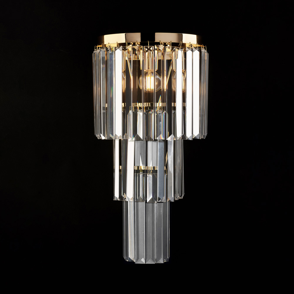 Elegant und ausdrucksstark präsentiert sich diese luxuriöse Wandleuchte aus Eisen und vergoldetem Messing mit Strasssteinen. Sie ist ein raffiniertes Beleuchtungselement, das Wände in ein warmes, einladendes Licht taucht. Die vertikale, mehrstufige Struktur ist mit transparenten Strasssteinen verziert, die ein raffiniertes Lichtspiel erzeugen und dem Raum Tiefe und Charakter verleihen.