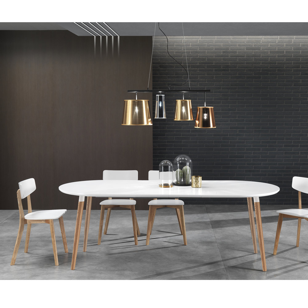 Runder Esstisch mit Platte aus mattweiß lackiertem MDF und Massivholzbeinen mit Eichenfinish. Ein Produkt mit einem einfachen und klaren Design, ideal für diejenigen, die einen essentiellen und vielseitigen Möbelstil lieben, der den Stil ihres Esszimmers oder ihrer Küche mit Geschmack und Persönlichkeit ergänzt. Seine Stärke stellt das ausziehbare Oberteil dar, das dank zweier Verlängerungen von je 50 cm eine Länge von 170 bzw. 220 cm erreicht.