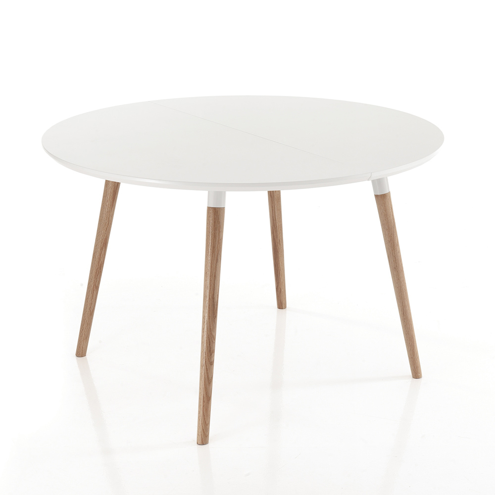 Ausziehbarer Esstisch mit runder Platte aus mattweiß lackiertem MDF.