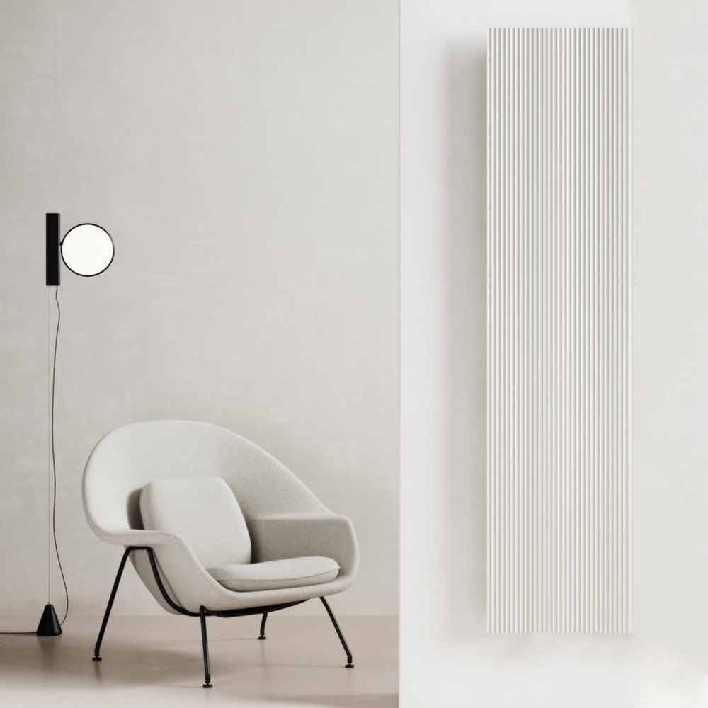 Dieser elektrische Heizkörper verfügt über ein modernes Design, bei dem der eigentliche Protagonist die Architektur ist, die sich durch Linien mit wechselndem Rhythmus auszeichnet, die Lichtspiele und Dialoge mit dem umgebenden Raum erzeugen.