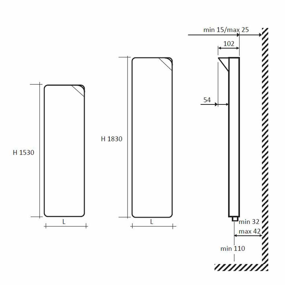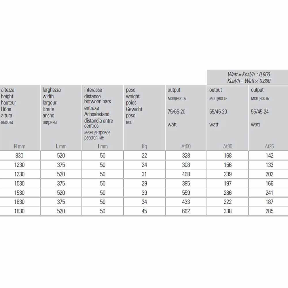 • H 1830 x L 520 x Inter. 50 x P 48 mm x Ausgang w (Δt50 °) 662; Ausbeute w (Δt30 °) 338; Ausbeute w (Δt26 °) 285