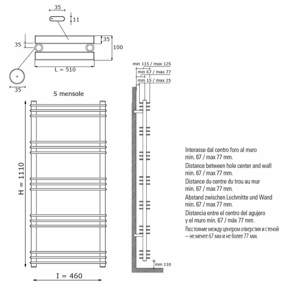 Maße *:- H 1110 x L 510 x P 35 x Inter. 460 mm x Ausgang w (Δt50 *) 530; Ausbeute w (Δt30 *) 290; Ausbeute w (Δt26 *) 240.