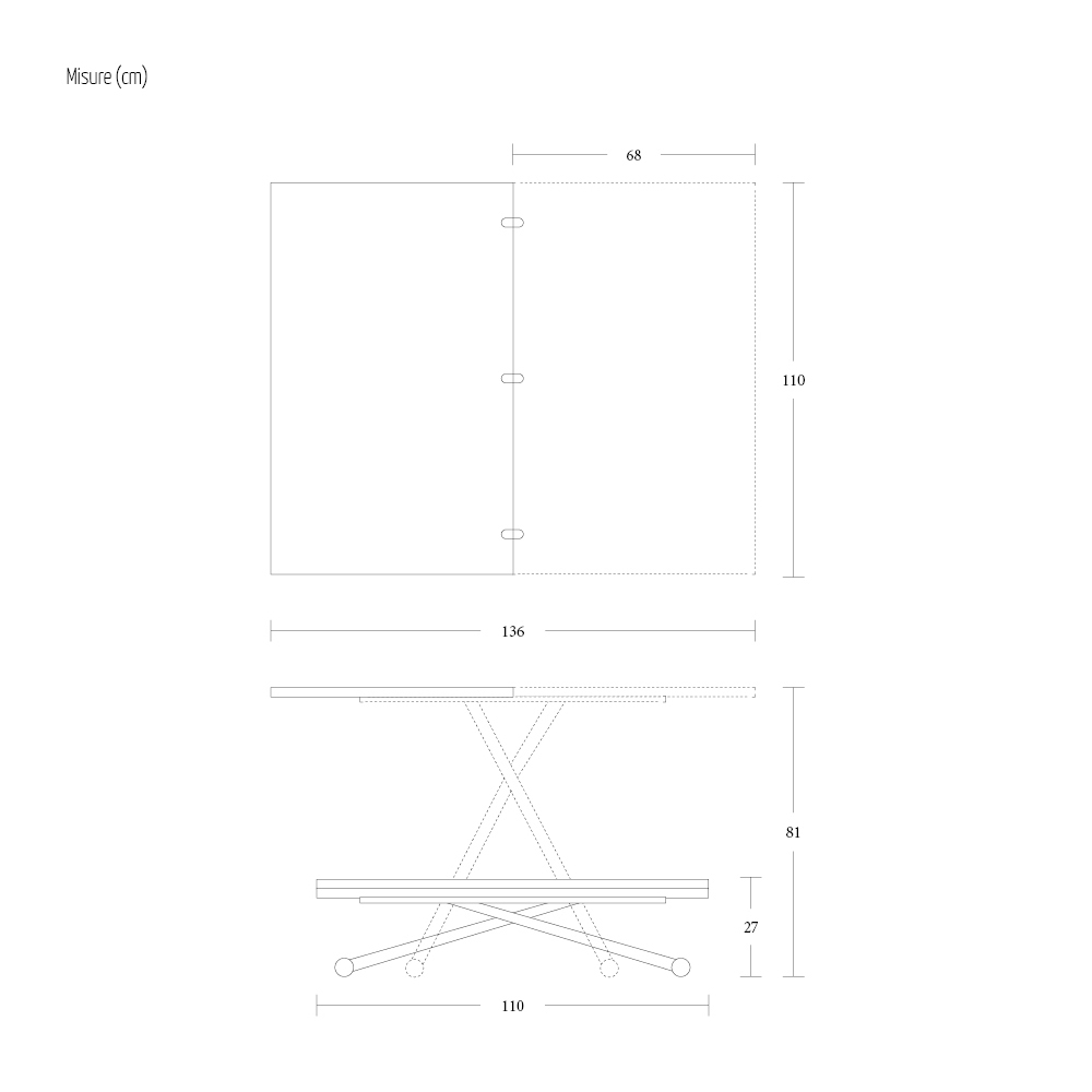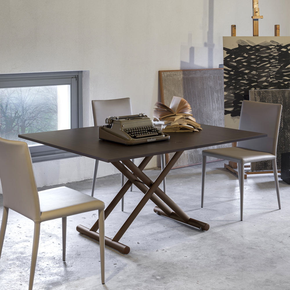 Konzipiert und designt speziell für alle, die einen modernen Couchtisch suchen, der bei Bedarf zu einem praktischen und funktionalen Esstisch werden kann, verfügt er über eine Klappöffnung und einen Gasmechanismus, mit dem Sie die Höhe millimetergenau von 27 bis 81 cm einstellen können einen einzigartigen Artikel mit einer starken Persönlichkeit zum Leben erwecken. Inklusive einziehbarer Räder.