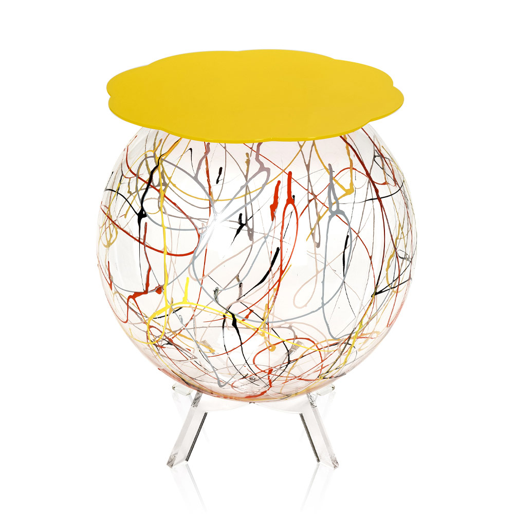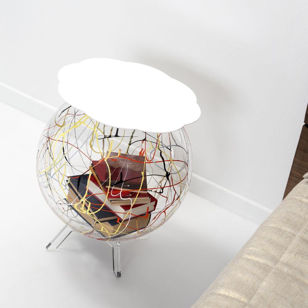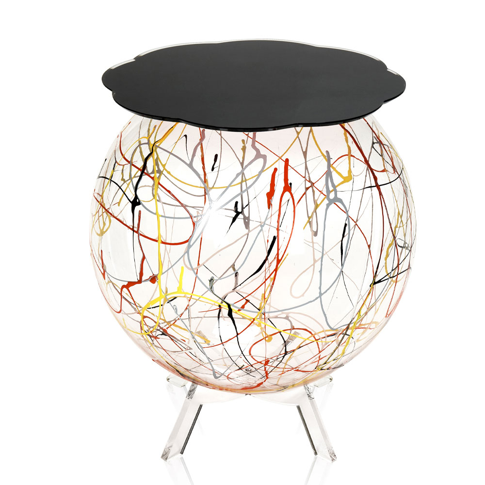 Die kugelförmige und breite Struktur besteht komplett aus transparentem Plexiglas aus 100% Virgin Polymer mit Sprühlackierung als Hommage an Jackson Pollock und das Regal in verschiedenen Farben erhältlich. Das endgültige Design ist somit originell und einfach im Haus zu platzieren.