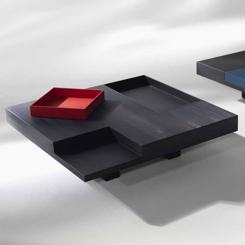 moderner viereckiger Couchtisch, ausgestattet mit eingekapselten Serviertabletts. Die Serviertabletts können beliebig und schnell herausgenommen werden und auch wieder in den vorgesehenen Flächen eingesetzt werden. Die Tabletts sind in unterschiedlichen Farben verfügbar: schwarz lackiert, rot, blau oder gelb. Den jeweiligen Farbton entnehmen Sie bitte aus der entsprechenden Farbpalette und geben diese in der freien Leiste an.