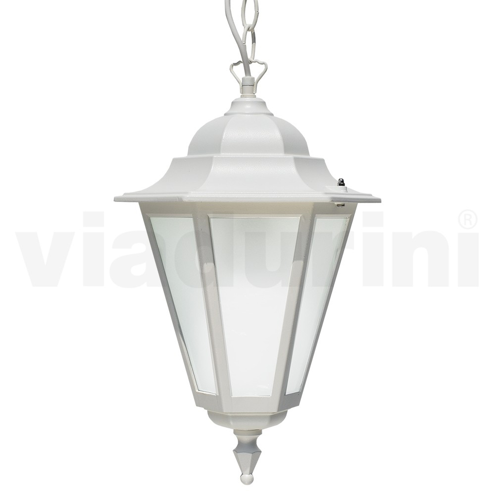 Pendelleuchte für den Außenbereich, komplett in Italien hergestellt , mit Struktur aus Aluminiumdruckguss in geprägtem Weiß und Glasdiffusor . Komplett mit Edelstahlschrauben. Ein eindrucksvolles und elegantes Design, das sich durch präzise Linien und Dekorationen im Vintage-Stil auszeichnet und jeden Außenbereich mit Persönlichkeit und Charakter bereichert. Ideal für Umgebungen wie Gärten, Innenhöfe, Alleen und Gehwege, aber auch für gewerbliche Räume wie Bars und Restaurants.