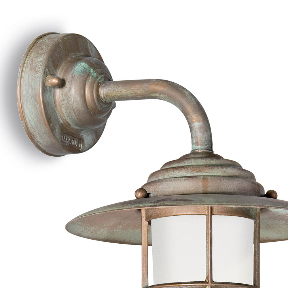 Inspiriert von klassischen Außenlaternen , vereint diese Wandleuchte aus Messing traditionelle Handwerkskunst mit zeitloser Eleganz . Die Messingstruktur mit Antik-Finish unterstreicht den charakteristischen Charakter des Metalls und verleiht jedem architektonischen Umfeld eine individuelle Note.