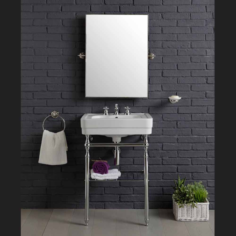 In der Komposition enthaltene Teile: - Weißes Keramikwaschbecken. Maße: L. 50 cm x D. 40,5 cm - Metallfuß komplett mit Gitter, verchromt L. 41 cm x H. 76 cm x Wandvorsprung 34 cm - Mit Abfluss klopfen - Siphon - Ablassen - Rechteckiger Kippspiegel mit verchromtem Messingrahmen 76,5 cm x 57,5 cm. - Ring Handtuchhalter - An der Wand montierter Seifenhalter aus Keramik