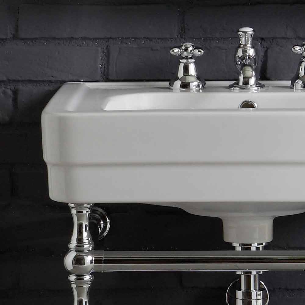 Badezimmermöbel Zusammensetzung mit Waschbecken auf Beauty Metallstruktur Beauty ist eine wunderschöne und faszinierende Badezimmermöbelkomposition mit einem Waschbecken aus weißer Keramik im Stil des 900 '. Diese wunderschöne Komposition umfasst ein elegantes und geräumiges Waschbecken, das an der Wand befestigt ist und auf einer eleganten Metallstruktur in Chromoptik ruht, die einen zarten Lichtpunkt für die gesamte Komposition erzeugt. Die verchromte Struktur besteht aus einer Metallbasis mit einem nützlichen und funktionalen Metallgitter. Um der gesamten Komposition einen weiteren Hauch von Licht zu verleihen, sind ein wunderschöner Wasserhahn und ein Siphon, ebenfalls in Chromoptik, Teil dieser Komposition. Eine weitere Besonderheit dieser fantastischen Komposition sind die schönen rechteckigen und kippbaren Spiegel, die durch einen Rahmen aus verchromtem Messing angereichert sind. Die Schönheit wird durch einen schönen und eleganten Wandseifenhalter aus Keramik mit Chromdetails und einen originellen und kreativen Ringwandtuchhalter, ebenfalls in Chromoptik, vervollständigt und bereichert. Beauty wurde entwickelt, um Ihrem Zuhause einen Hauch von 900-Zoll-Design zu verleihen und dabei stets eine gewisse Modernität und Eleganz zu bewahren. Beauty besteht aus elegant quadratischen Linien und passt harmonisch in jede Art von Möbeln. Bringen Sie auch einen Hauch von Stil in Ihr Zuhause! Waschbecken mit den mitgelieferten Halterungen an der Wand befestigt!