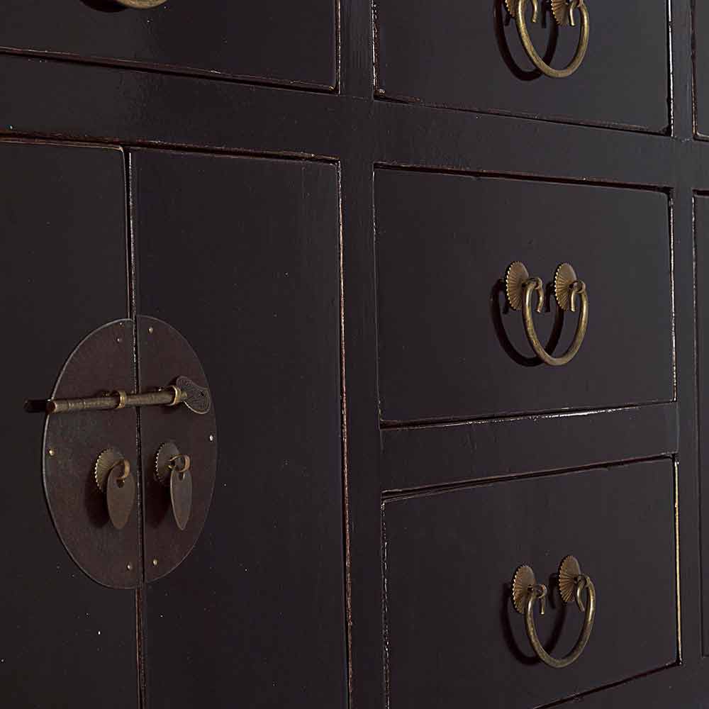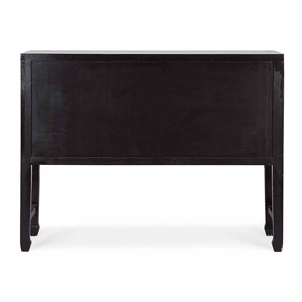 Schwarzer Konsolentisch aus Ulmenholz mit 5 Schubladen und 4 Türen im Vintage-Design.