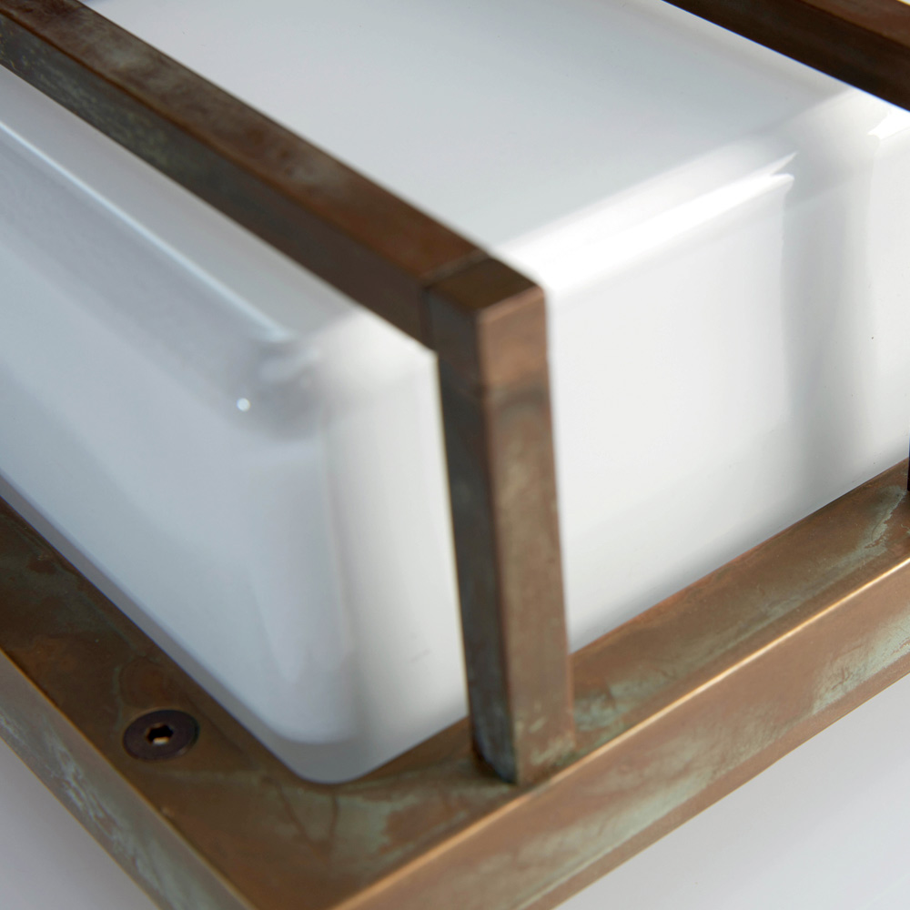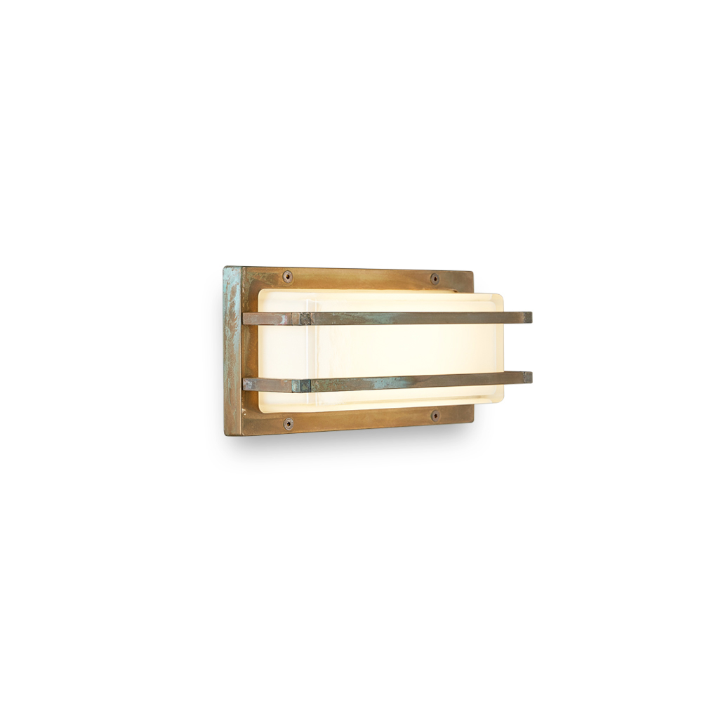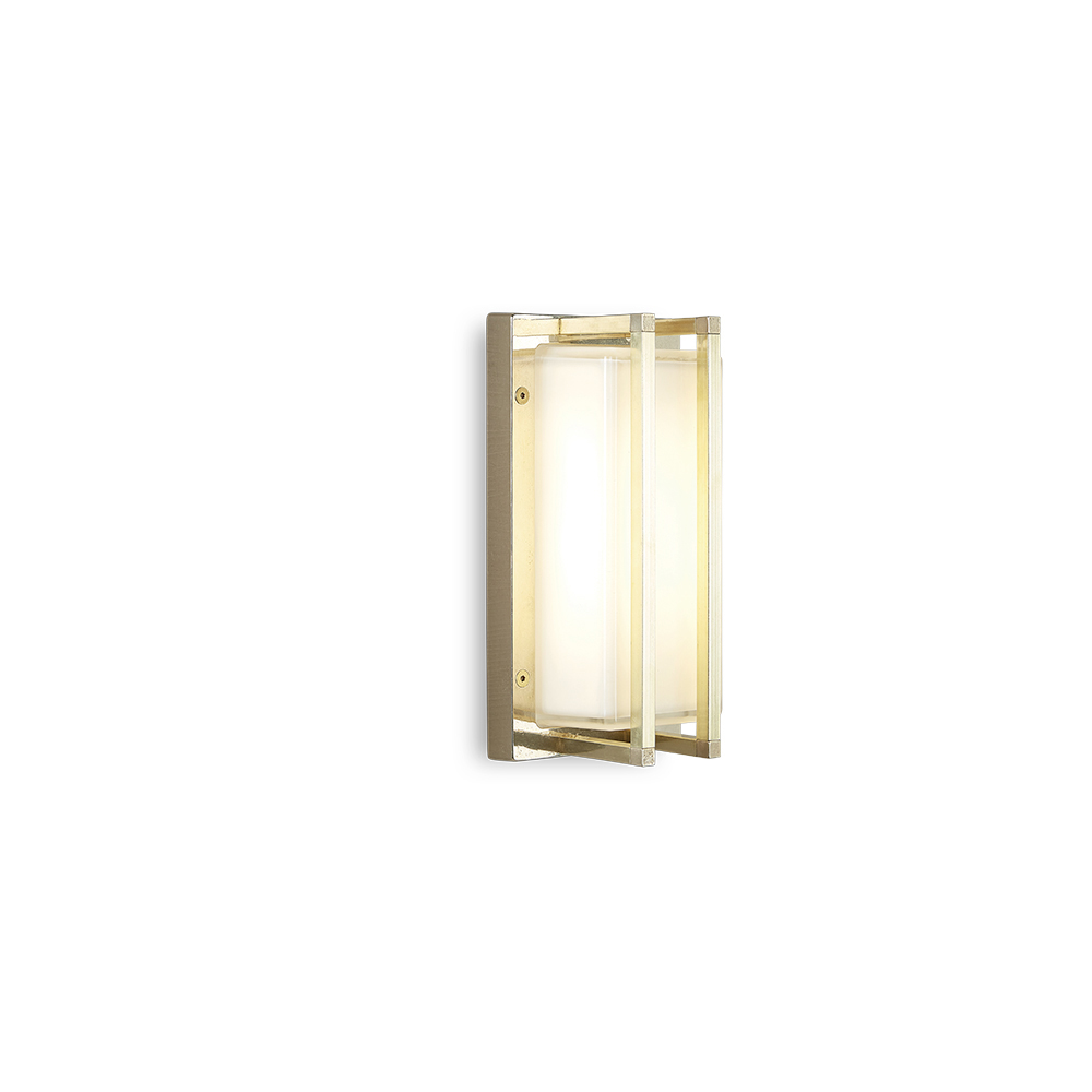 Diese schlichte und elegante, handgefertigte Wandleuchte ist eine raffinierte Beleuchtungslösung, die moderne Wände und zeitgenössische Räume perfekt in Szene setzt. Die Struktur aus Messingdruckguss in Kombination mit einem rechteckigen Diffusor aus Opalglas erzeugt ein weiches, gleichmäßiges Licht – ideal für eine einladende und zugleich funktionale Beleuchtung.