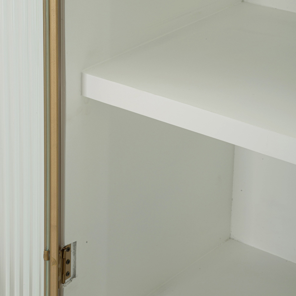Das weiße Finish mit vertikalen Rillendetails verleiht einen Hauch von optischer Struktur und Tiefe , während die Linien des Sockels und der Griffe einen warmen Kontrast erzeugen, der das Möbelstück noch mehr aufwertet. Seine abgerundeten Formen verleihen Räumen eine einzigartige Weichheit und bieten gleichzeitig großzügigen Stauraum, der mit internen Regalen und geräumigen Schubladen praktisch organisiert ist.