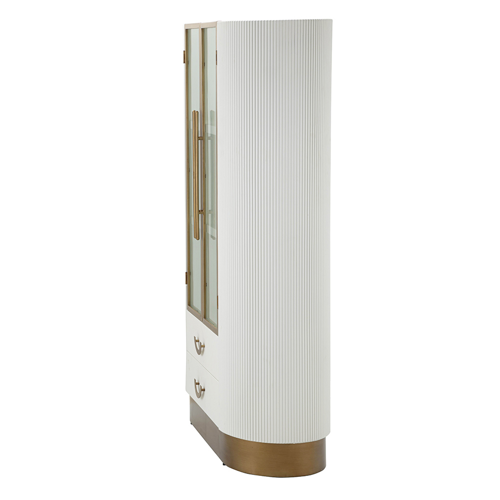 Diese Vitrine ist ein raffiniertes Design-Meisterwerk, das zeitgenössische Eleganz und Vielseitigkeit vereint . Die geschwungene Silhouette ist mit Glastüren verziert, die einen Blick auf das Innere bieten und sich perfekt für die Präsentation Ihrer Glaswaren oder Wertgegenstände eignen, jedoch mit einer Diskretion, die Ordnung und Raffinesse bewahrt.