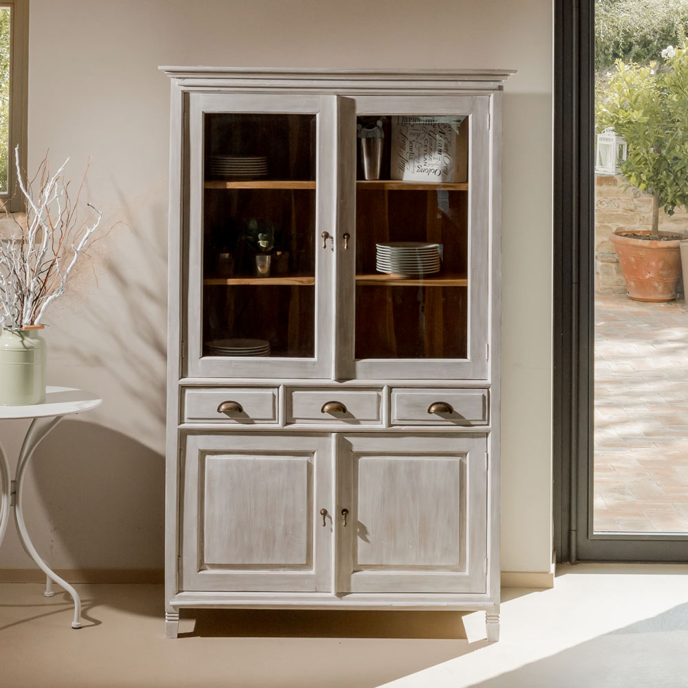 Dieser Vitrinenschrank eignet sich perfekt zur Präsentation von Geschirr, Dekorationsgegenständen oder Sammlungen und bietet Stauraum sowie eine elegante Präsentationslösung, die für Ordnung und visuelle Harmonie sorgt.