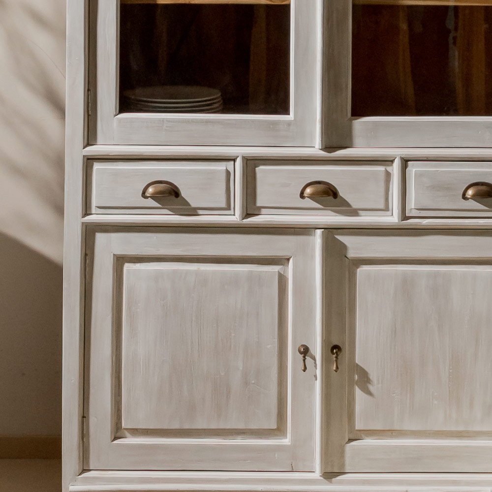 Leichte Unregelmäßigkeiten wie geringfügige Fehlausrichtungen von Türen, leichte Wölbungen, Oberflächenspuren, Füllungen oder Dübel sind normal, insbesondere bei der Verwendung von Altholz. Die Maße sind ungefähre Angaben und können, ebenso wie einige dekorative und stilistische Details, leicht abweichen.
