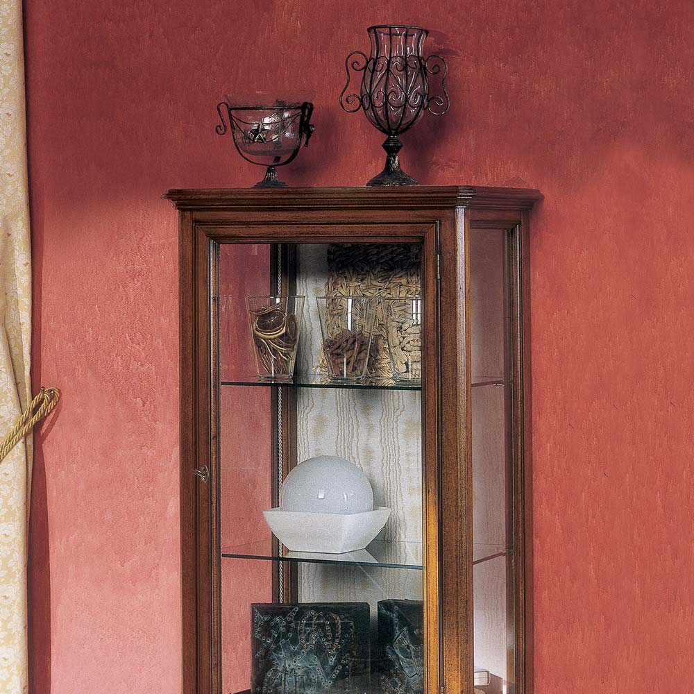 Vitrine mit Struktur aus furnierten Holzpartikeln aus Tanganjika/Toulipier , Rahmen aus Toulipier/Ayous, Böden und Rückwände aus MDF und Sperrholz mit 1 Glastür mit 2 Glasböden und 1 Schublade, komplett Made in Italy.
