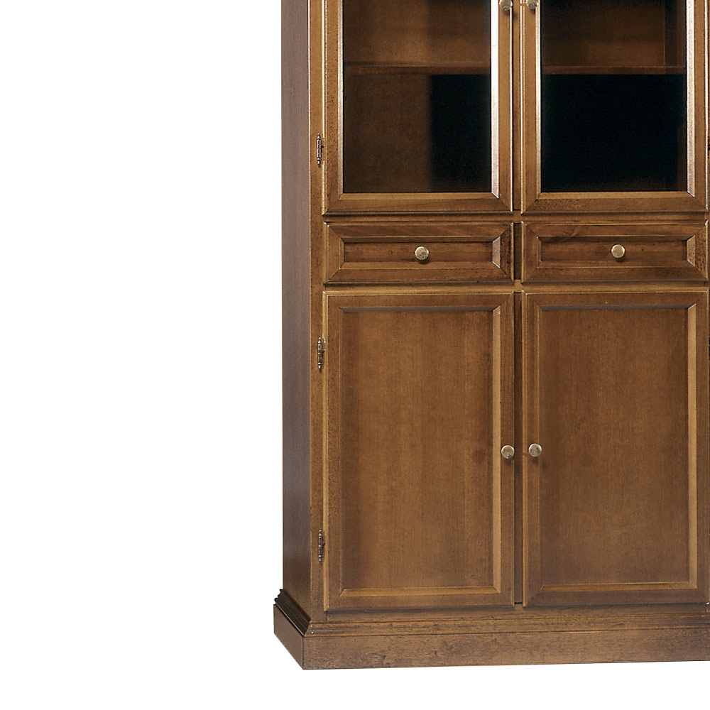 Vitrine mit Struktur aus Holz/Partikelholz furniert in Tanganjika/Toulipier/Ayous , Rahmen in Toulipier/Ayous , Sperrholzböden aus Pappel und/oder MDF mit 2 Glastüren, 2 Holztüren und 2 Schubladen, komplett Made in Italy.