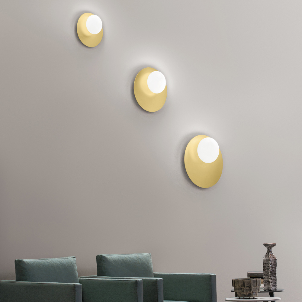 Wandleuchte für den Innenbereich mit einer Struktur aus recycelbarem Aluminium, einer Deckenrosette aus Metall und einer Lampe aus milchig weißem geblasenem Glas.