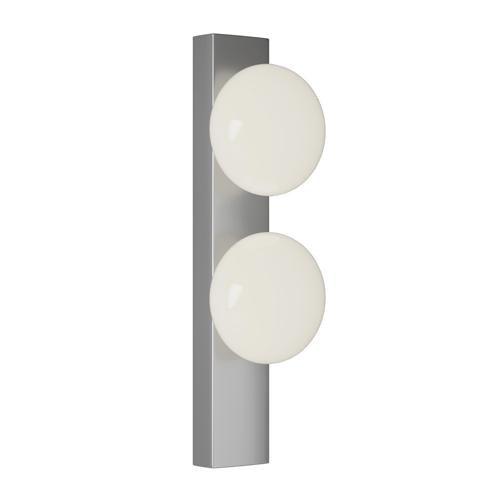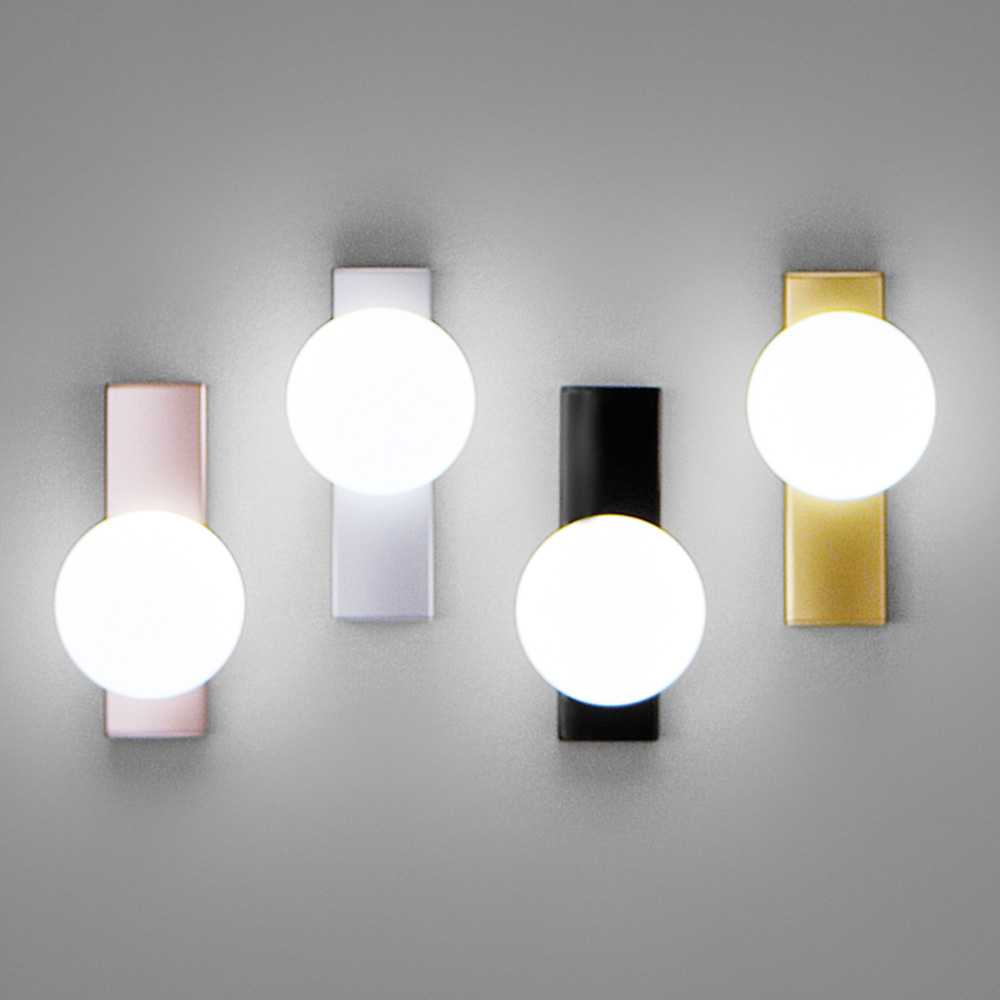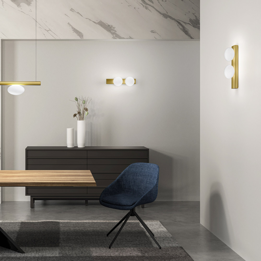 Diese Wandleuchte ist die perfekte Mischung aus geometrischem Design und raffiniertem Minimalismus . Die essentielle Komposition wird durch eine oder zwei leuchtende Opalglaskugeln verstärkt, die ein weiches, einladendes Licht verbreiten, ideal für die Schaffung einer entspannenden und anspruchsvollen Atmosphäre.