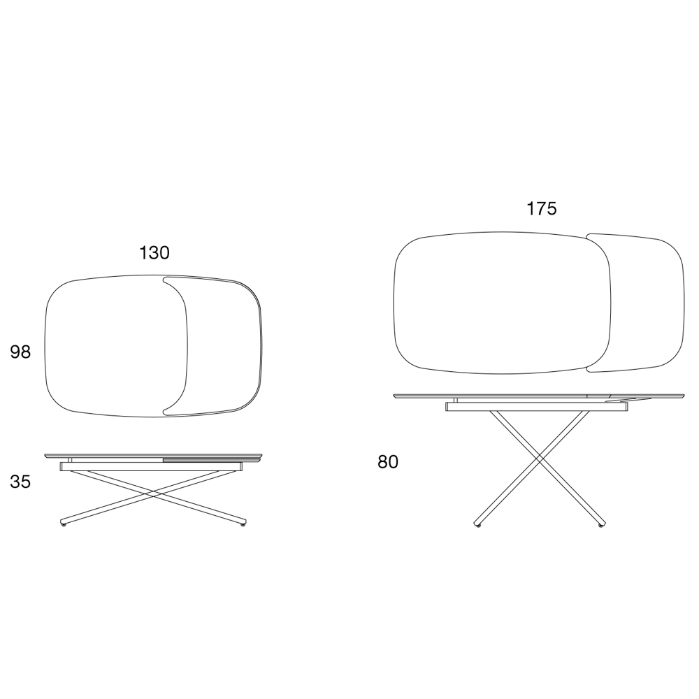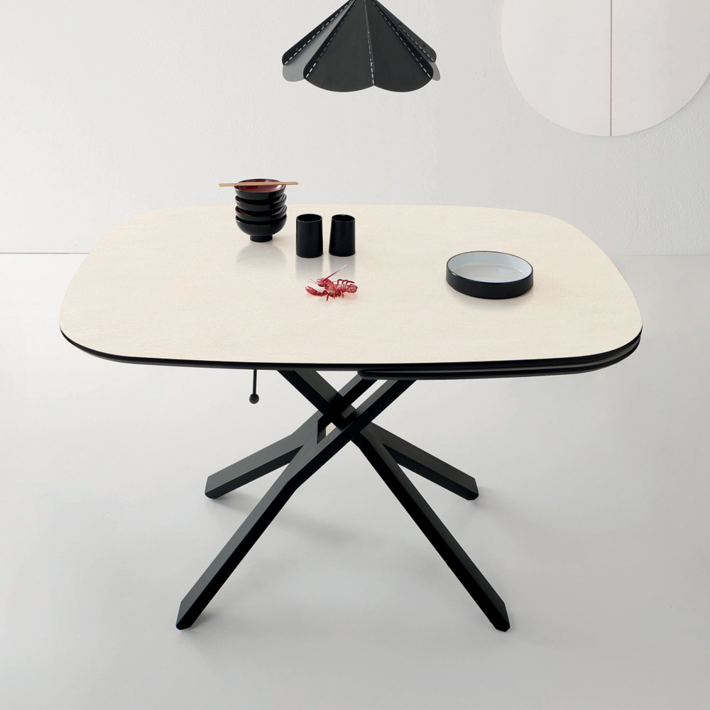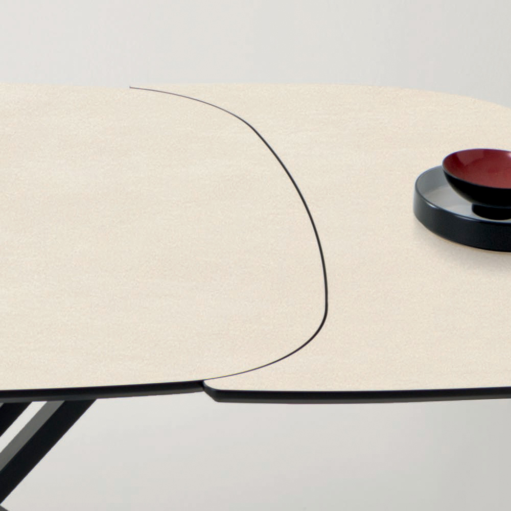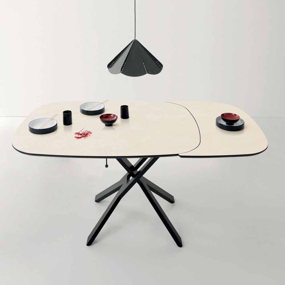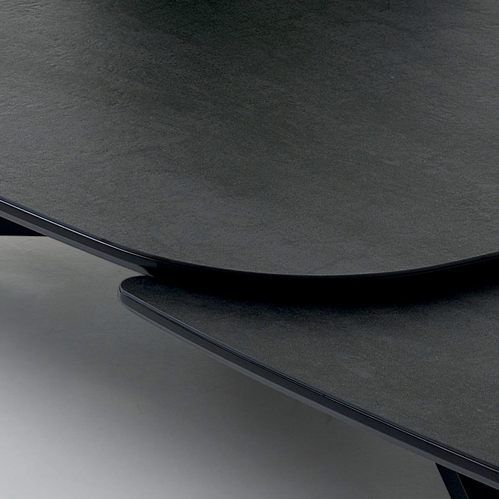 Dieser Couchtisch verwandelt sich in ein Esstisch und kann durch einen Gasmechanismus verlängert werdenverfügt über einen pulverbeschichteten Metallfuß in geprägtem Schwarz mit einziehbaren Rädern und eine elliptische Platte aus mattierter Keramikauf Paneel mit ausziehbarem Design.