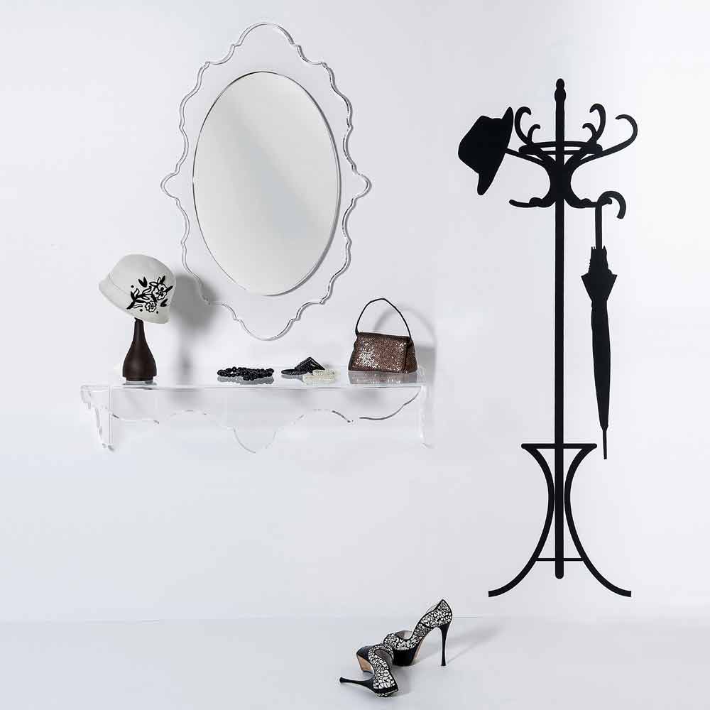Wandkonsole aus transparentem Plexiglas Bianca, hergestellt in Italien Sapore d'art nouveau für die Konsole Weiß in Plexiglas PMMA 100% reines Polymer vollständig transparent, lasergeschnitten und thermogeformt bei hohen Temperaturen. Der Wandanker wird von 2 Metallankern von tecnodesign unterstützt. Plexiglas ist stoßfest, nicht verformbar, unveränderbar und wärmeisolierend. Die Helligkeit und Helligkeit werden über die Zeit konstant und unverändert beibehalten. Das PMMA Plexiglas aus reinem Polymer ist ungiftig, hypoallergen, geruchlos und antibakteriell. 100% recycelbar. Entworfen, entworfen und hergestellt in Italien mit italienischen Materialien.