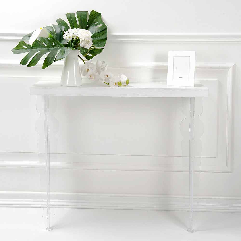 Insbesondere diese Wandkonsole repräsentiert die perfekte Verschmelzung von Acrylkristall und den warmen Essenzen des Holzes.