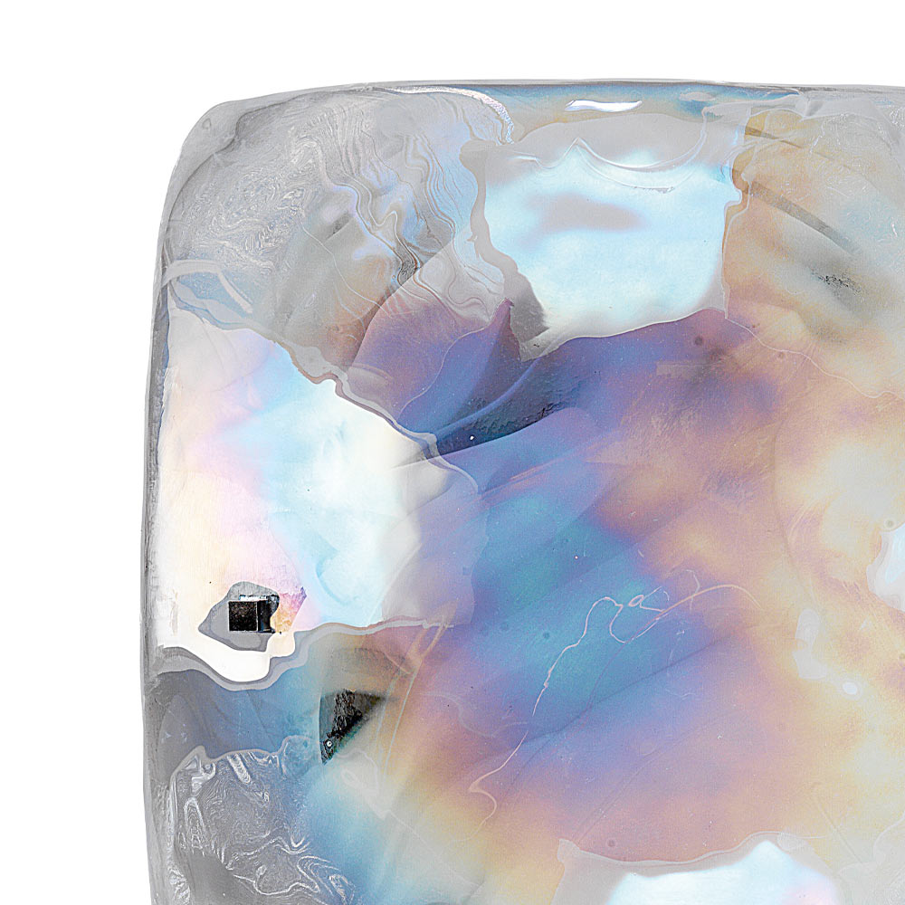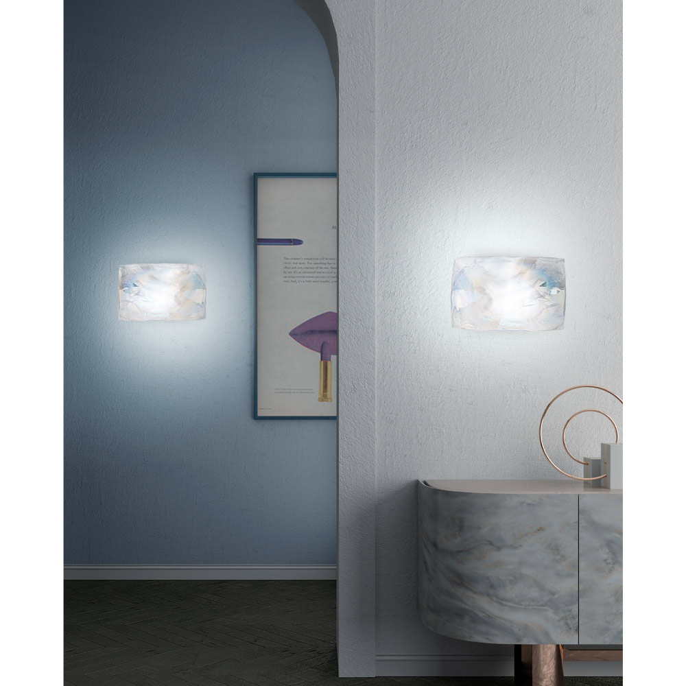 gestreiftem weißem Flachglas mit Iris-Dekor (Perlmutteffekt), das der Umgebung dank der besonderen Textur und der beispiellosen visuellen Wirkung des Glases einen Hauch von raffinierter Eleganz verleiht Ergebnis mit großer Persönlichkeit.