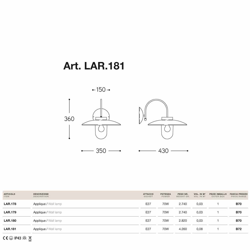 Sockel: E27 Leistung: 70 W Gewicht: 4260 gr IP: 43 Glühbirne nicht enthalten https://www.viadurini.ch//data/prod/img/applique-la-traviata-in-rame-vetro-e-ottone-anticato-2.jpg465.48246963InStockVintage WandleuchtenAldo Bernardi000.02015-12-11 08:50:42Made in Italy