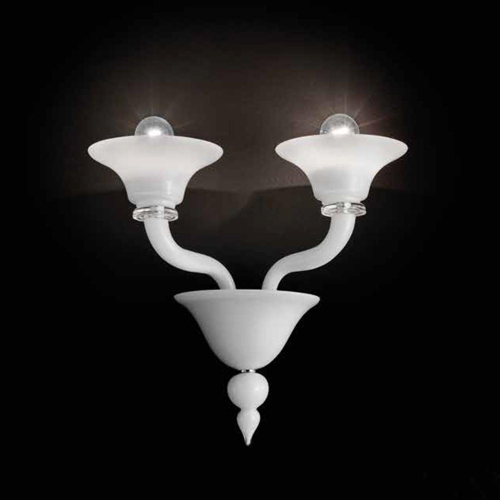 2-flammige Wandleuchte, hergestellt in Italien aus venezianischem Glas mit milchweißem Finish - handgefertigter Kristall mit Metalldetails in poliertem Chrom-Finish . Eine beispiellose Begegnung zwischen historischen Linien und zeitgenössischem Design , um einem Möbelstück mit zeitlosem Charme und Eleganz Leben einzuhauchen. Ihre Ästhetik zeichnet sich durch ein gegliedertes Volumen aus, das durch die leuchtende Vibration der wunderbaren mundgeblasenen Glasflächen dynamisch und leicht wird, die die eleganten transparenten Arme mit den Schalen abwechseln, die durch die Verwendung der Gehäusetechnik hergestellt werden . Seine Wertigkeit wird durch die Liebe zum Detail unterstrichen, die von den verchromten Metallkomponenten ausgeht, die es dem Produkt ermöglichen, sich an unterschiedliche Geschmäcker und Anwendungssituationen anzupassen.
