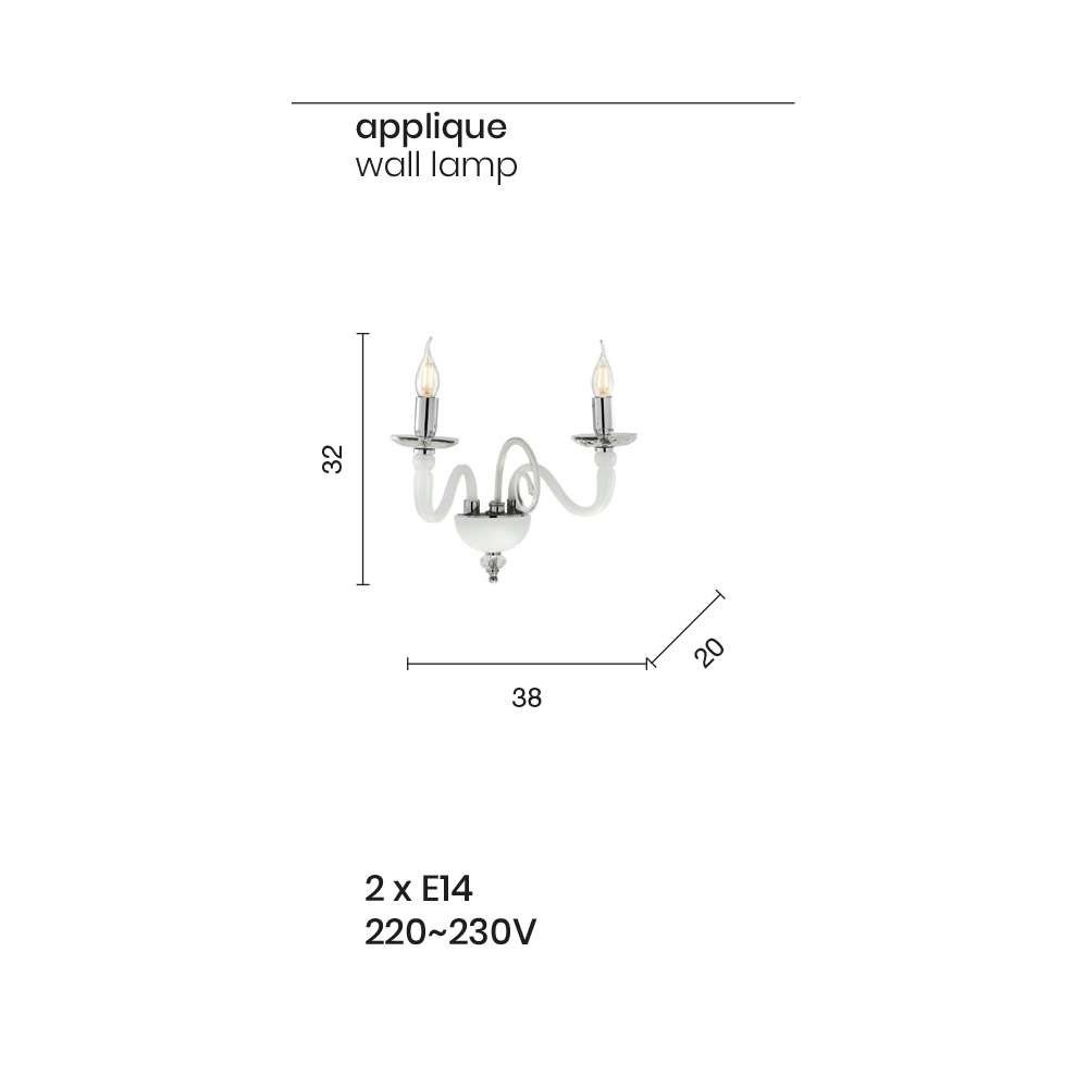 Diese 2-flammige Wandleuchte hat ein klassisches Design mit einer raffinierten und eleganten Form, die aus bogenförmigen Armen aus handbearbeitetem Glas besteht, auf denen die Untertassen aus kostbarem optisch geschliffenem Kristall ruhen.