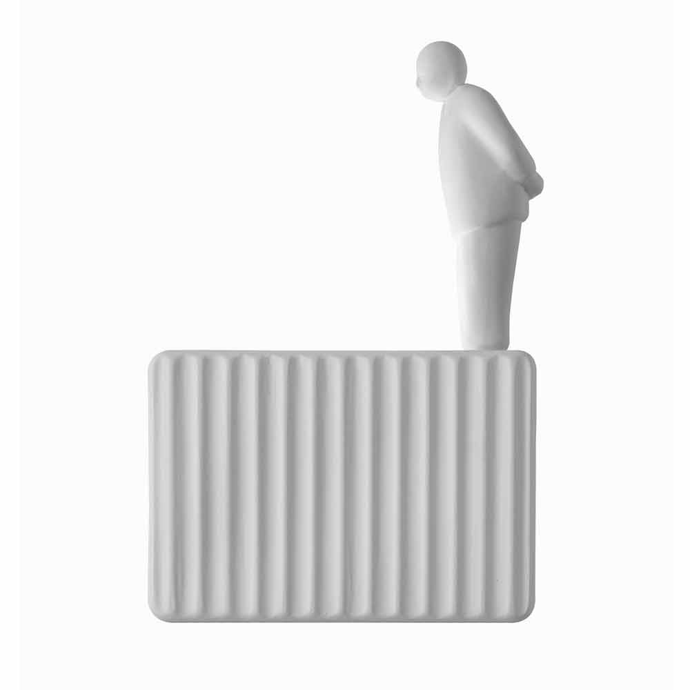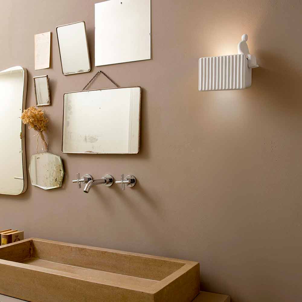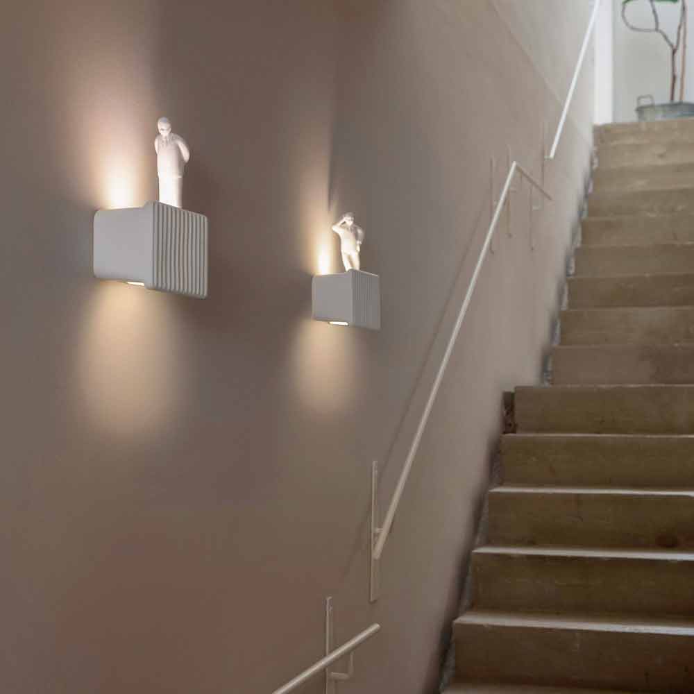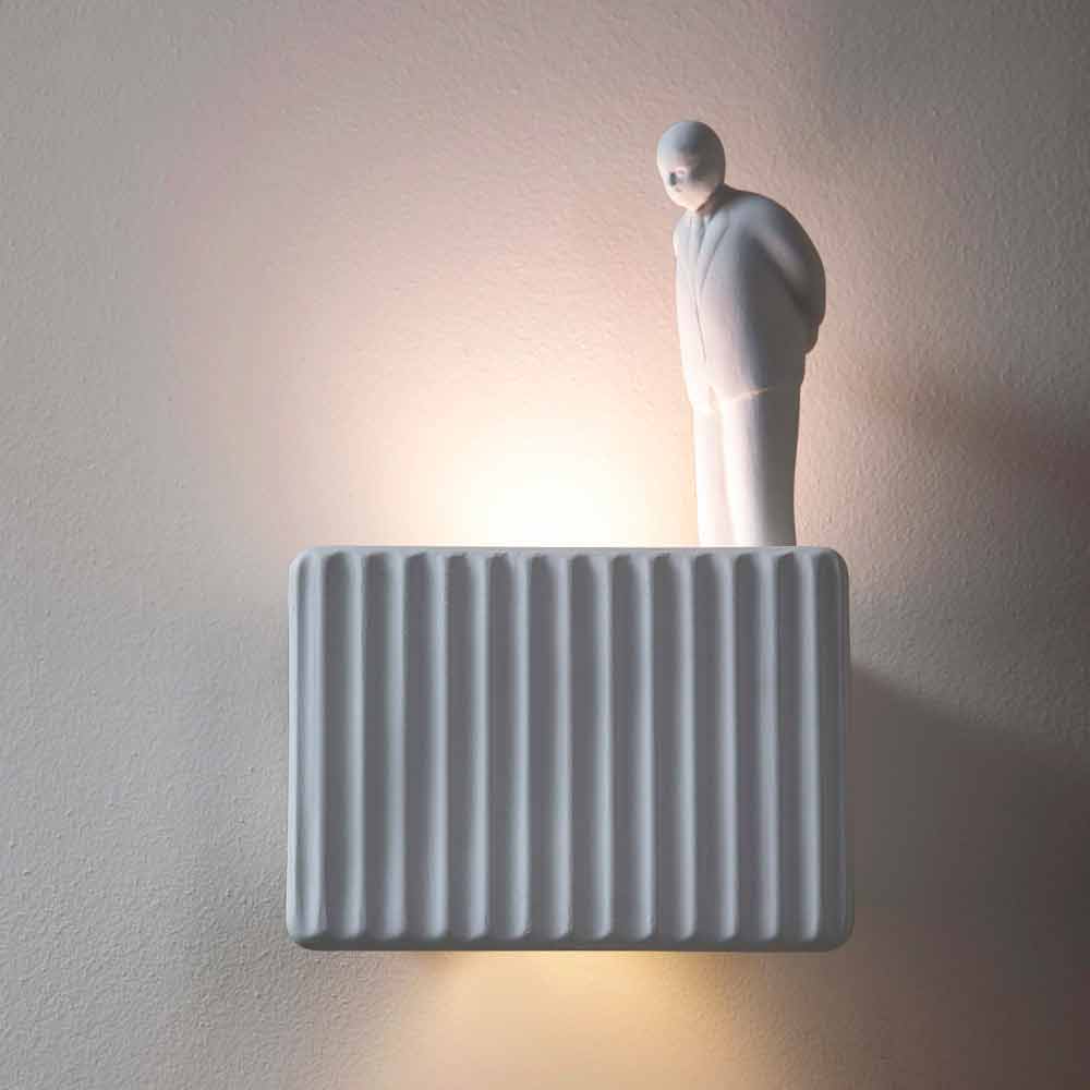 Diese originelle und einzigartige Wandleuchte repräsentiert die Bewegung, die in den letzten Jahren ein erfolgreiches Medienphänomen erlebt hat und die den Umarell oder den typischen älteren Rentner, der Baustellen oder öffentliche Arbeiten betrachtet, als Protagonisten betrachtet. Es ist ein Konzept, das ironischerweise in Italien zum Leben erweckt und dann auf den Rest der Welt übertragen wurde, um die Produktion für alle Büro- und Computerarbeiter zu stimulieren und zu verbessern.