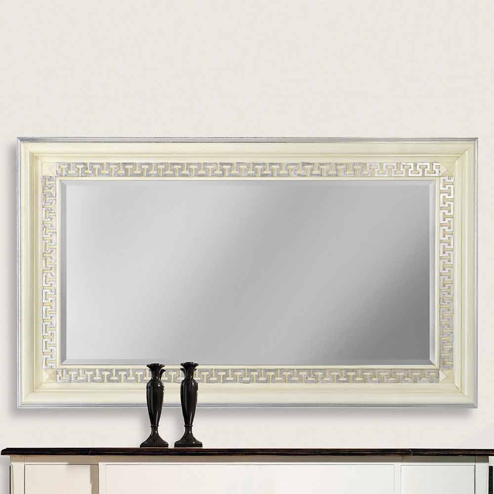 Dieser Spiegel ist ein elegantes Beispiel, das eine zeitgenössische Ästhetik mit klassischen Akzenten verkörpert. Das Design verfügt über einen dünnen und raffinierten Rahmen mit fein eingelegtem griechischen Schlüsselmotiv, einem zeitlosen Klassiker, der Unendlichkeit und Ewigkeit symbolisiert.