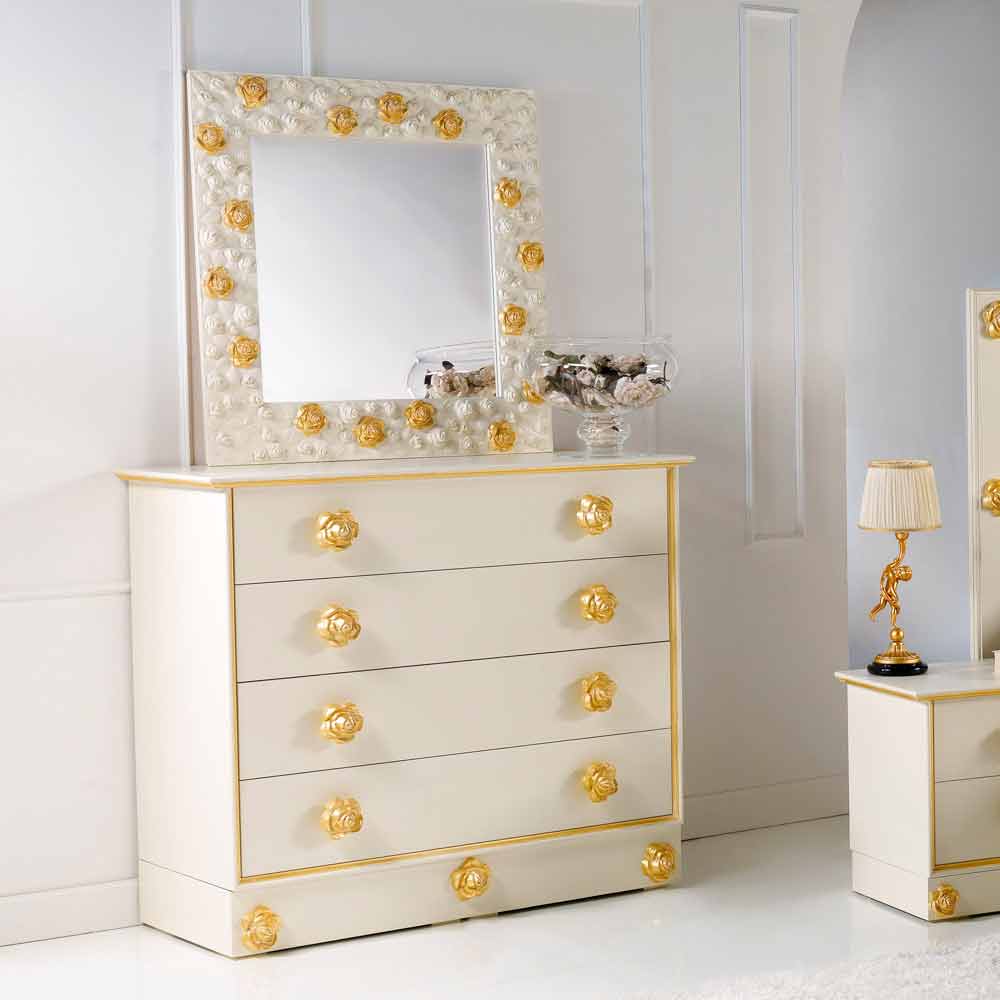 Der Spiegelrahmen besteht aus glatten Holz mit einen Weißen Hintergrund. Der Bilderrahmen wurde mit zartgoldenen Rosen verziert. Der Spiegel selbst besteht aus einer hochwertigen Kristallspiegelfläche und weist eine Dicke von Dicke von 4 mm auf. Made in Italy. Inklusive Wandhalterung ! Der Spiegel kann vertikal als auch horizontal aufgehangen werden.