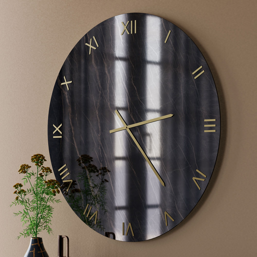 Wanduhr aus schwarzem Glas mit Marmoroptik und Messingzeigern in Goldoptik – Cortex
