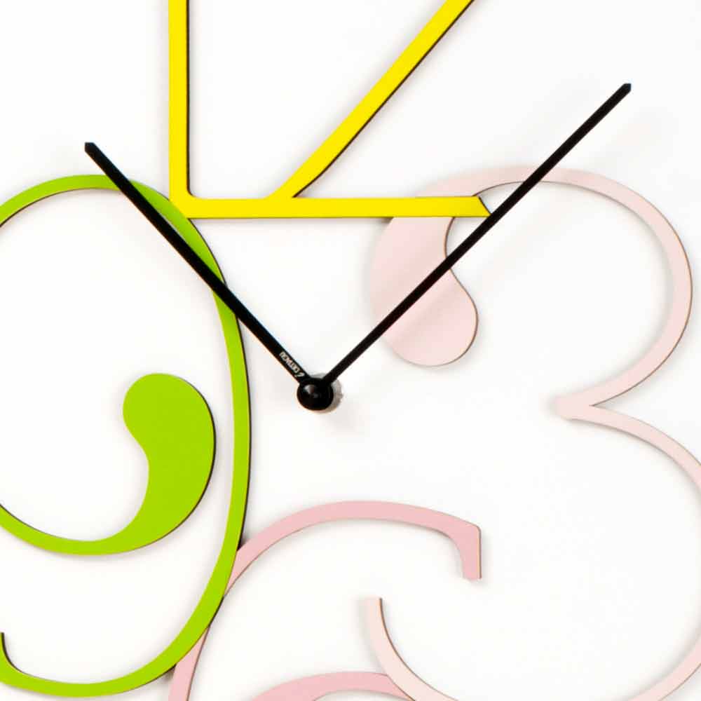 Es ist eine Uhr mit einem lustigen und verspielten modernen Geist aus Holz mit einer mattweißen Basis mit farbigen Zahlen, die mit einem Laser geschnitzt wurden, für eine einzigartige und gestalterische Kreation.