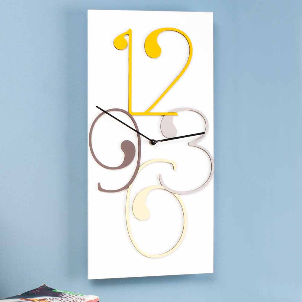 Wanduhr aus opakem weißem Holz mit farbigen Zahlen, zwei Versionen von rechteckigem und modernem Design made in Italy.