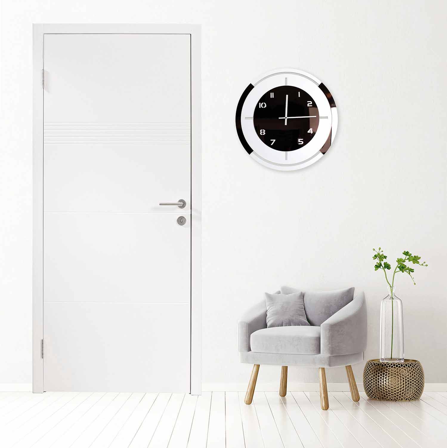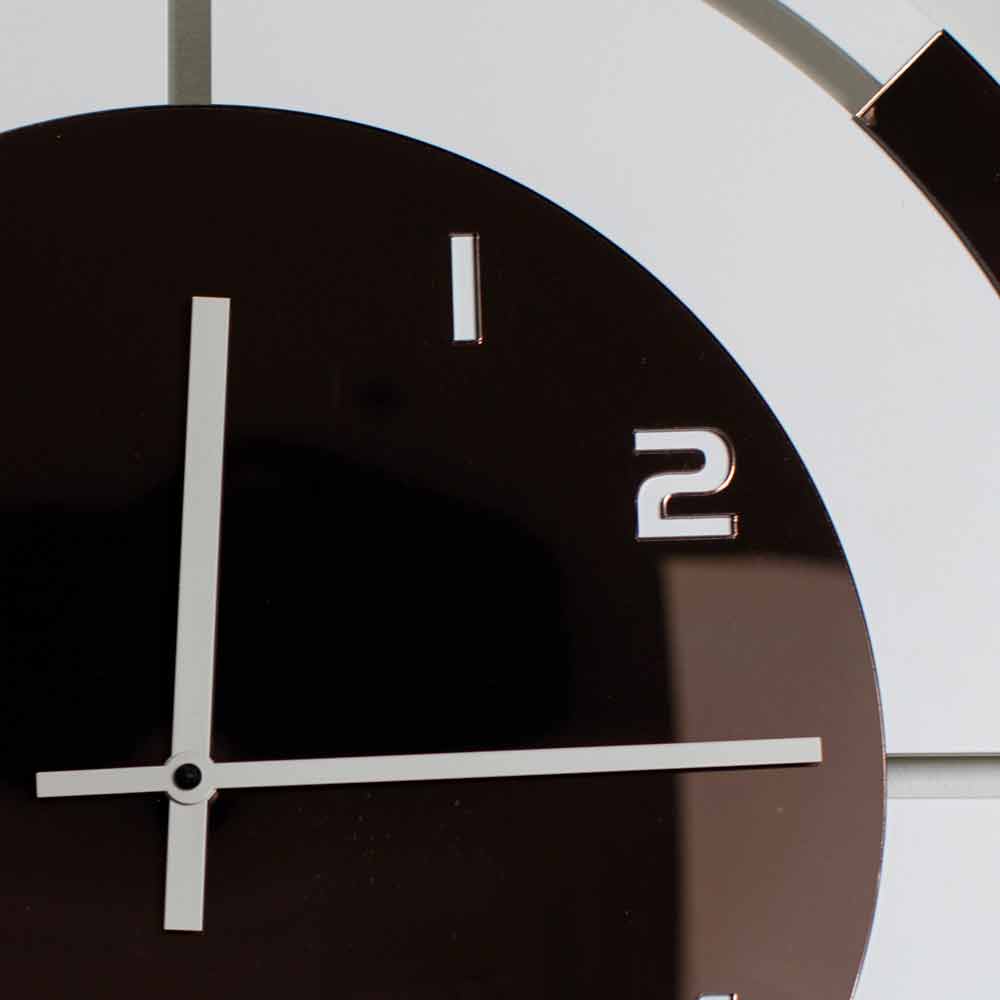 Runde Wanduhr aus weiß lackiertem Holz mit Dekorationen aus Bronze-Pelxiglas, modernes Design made in Italy.
