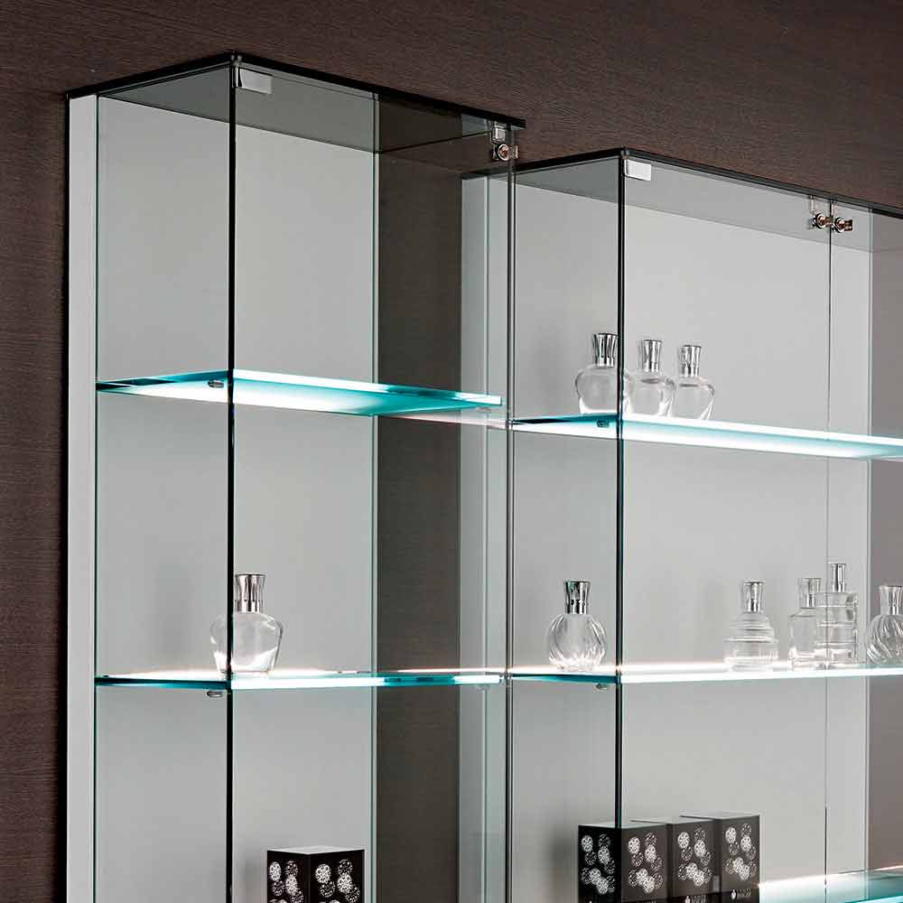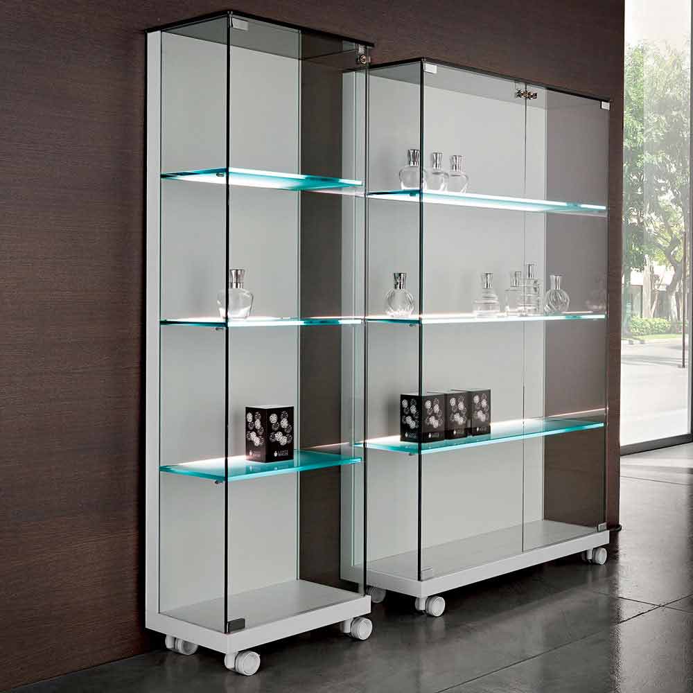 Wandvitrine aus Glas und weißem Holz, Rädern und beleuchteten Regalen - Armilla