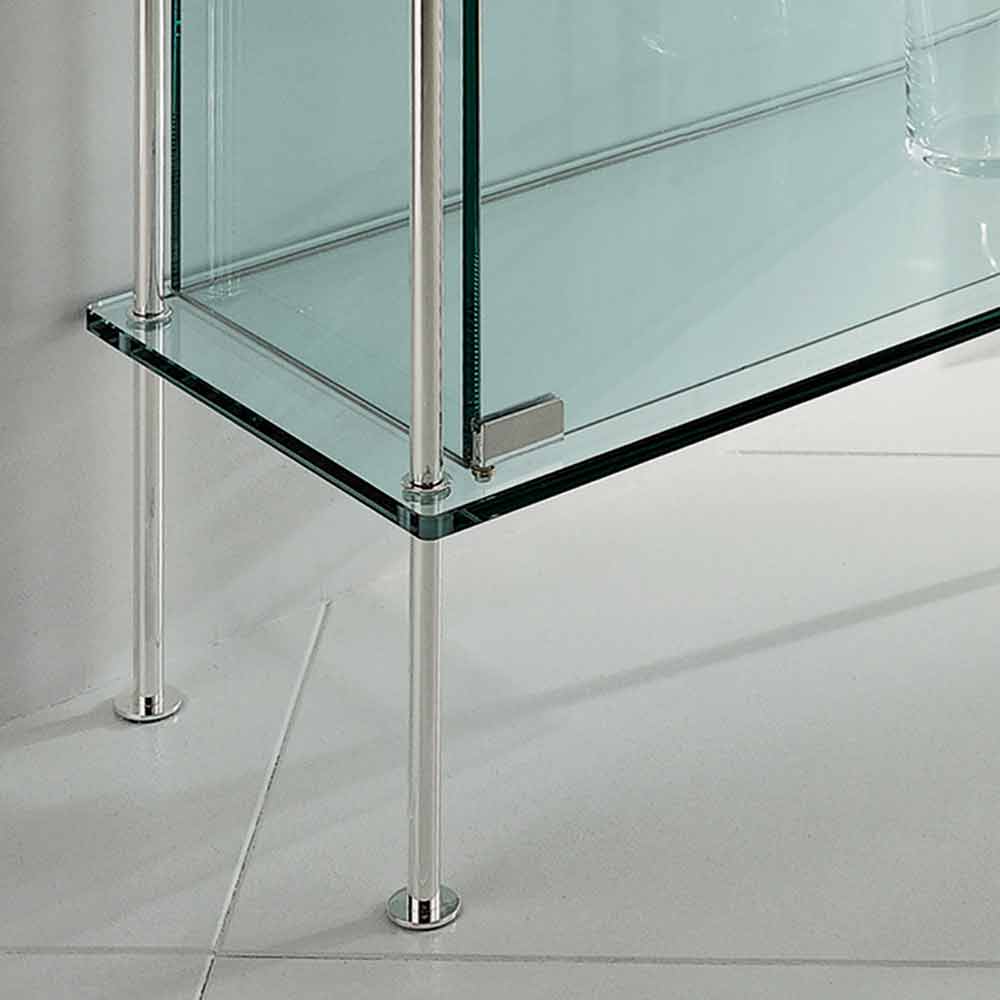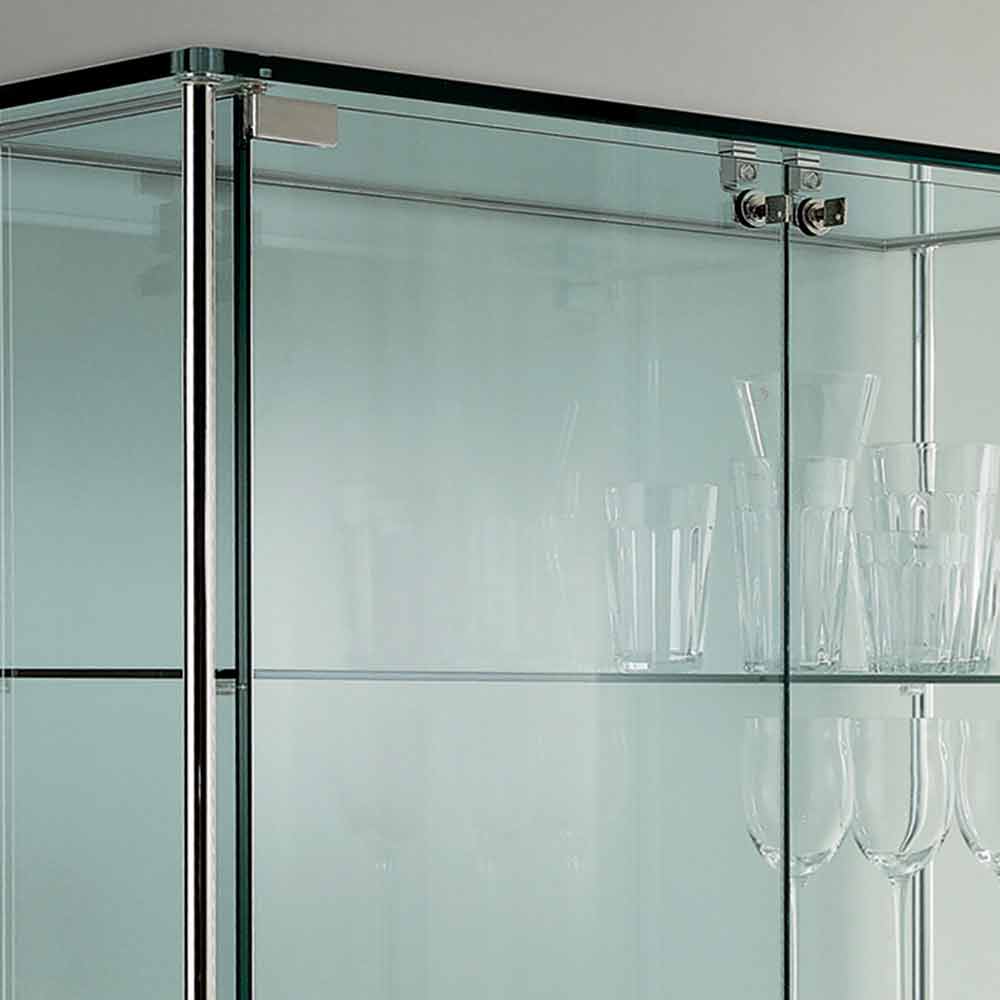 Die zweitürige Vitrine besteht komplett aus transparentem gehärtetem Glas mit Edelstahl-Metallverschluss und Stützen.