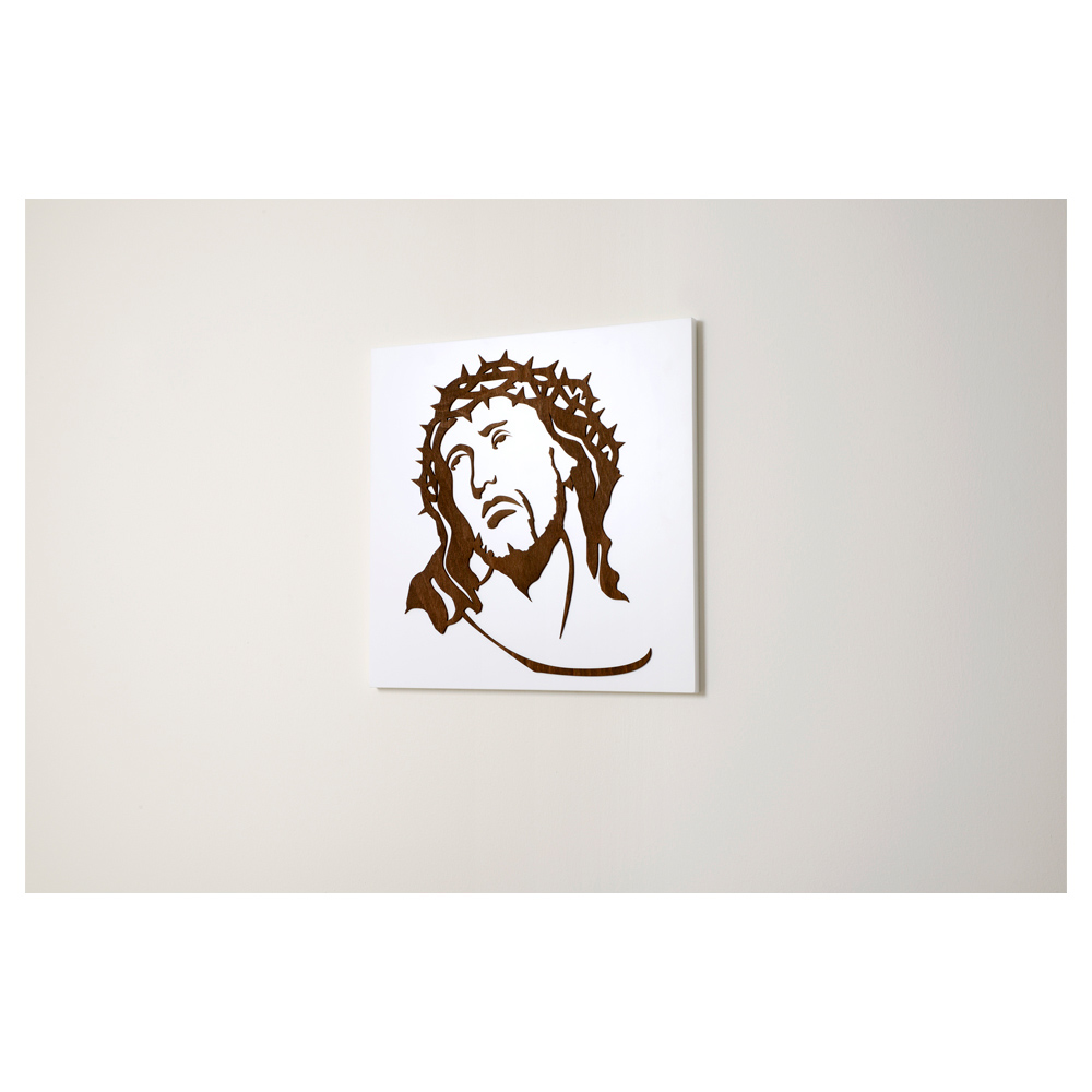 Sakraler Rahmen aus weiß lackiertem Holz mit Applikation des Antlitzes Christi aus Wengeholz.