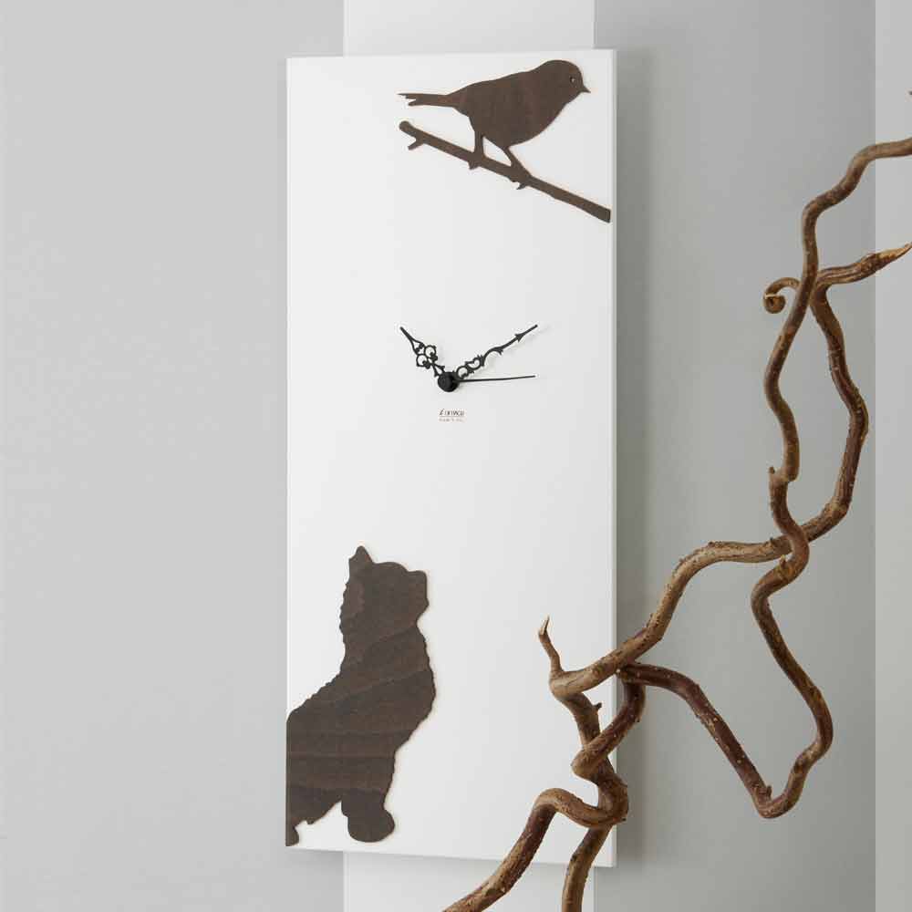Rechteckige Wanduhr aus mattweißem Holz mit Vogel- und Katzendesign, modernes Design hergestellt in Italien.
