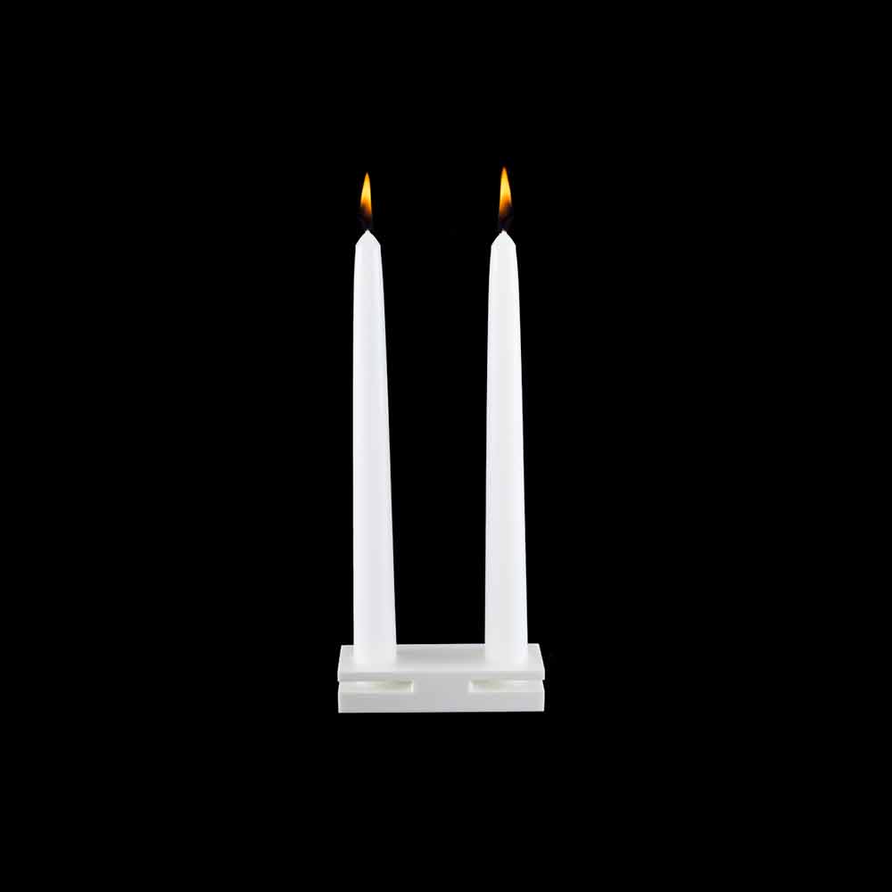 Es ist ein Kerzenhaltersockel für ein Paar Stiellampen für ein elegantes und essentielles Lichtspiel.
