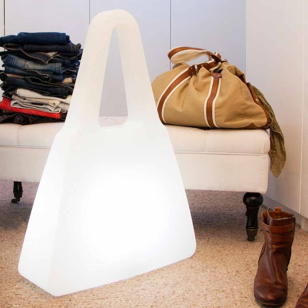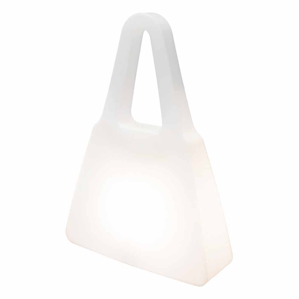 Taschenförmige Steh- oder Tischlampe, modernes Design aus Polyethylen mit LED-, Solar- oder E27-Anschluss.
