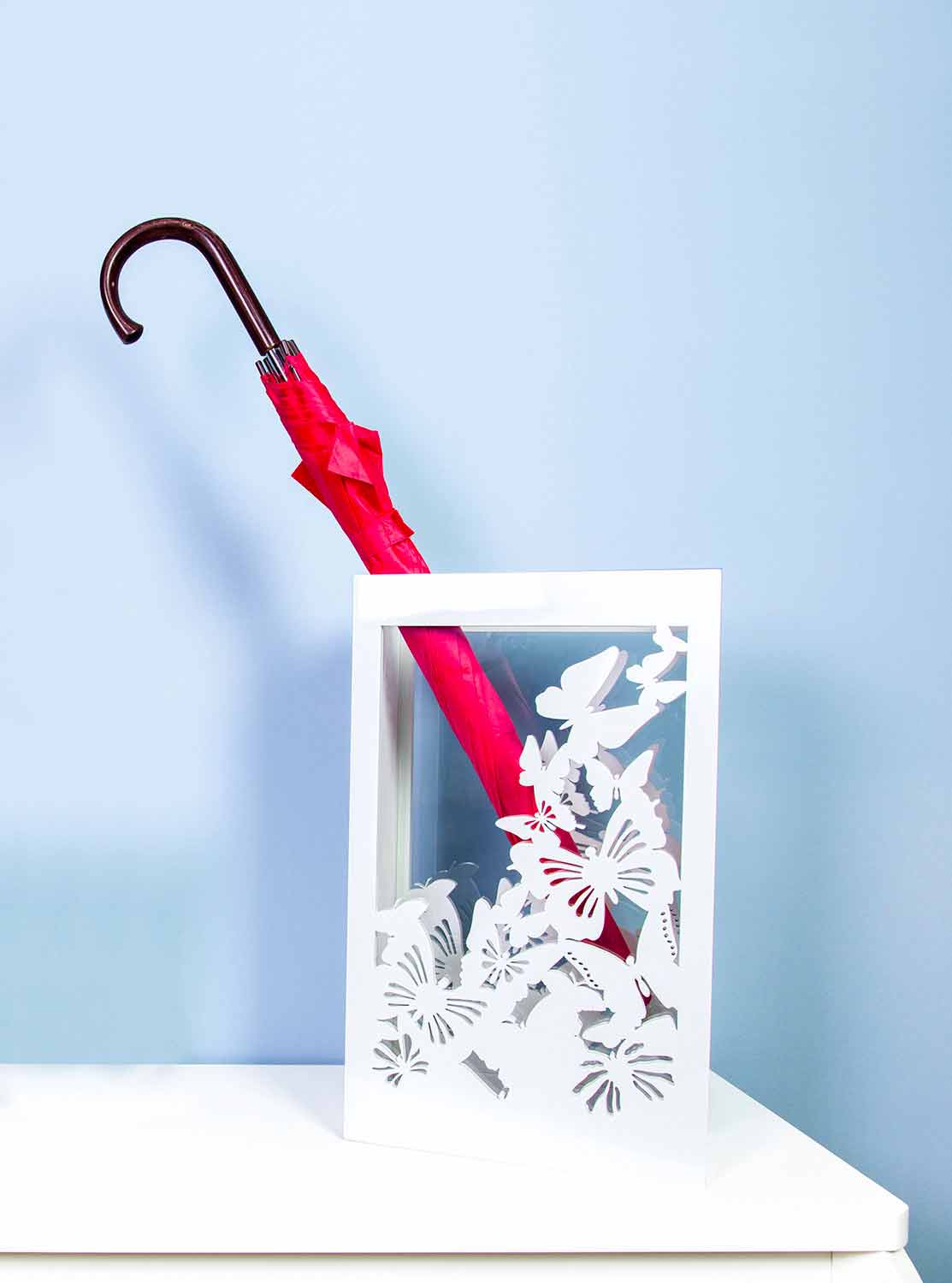 Spielen Sie mit Ihrer Fantasie und dekorieren Sie Ihren Wohn- oder Eingangsbereich auf schöne Weise mit dem Bodenschirmständer aus geformtem lackiertem Holz, der einen Haufen eleganter Schmetterlinge darstellt. Im Inneren befindet sich eine praktische Wassersammelschale.