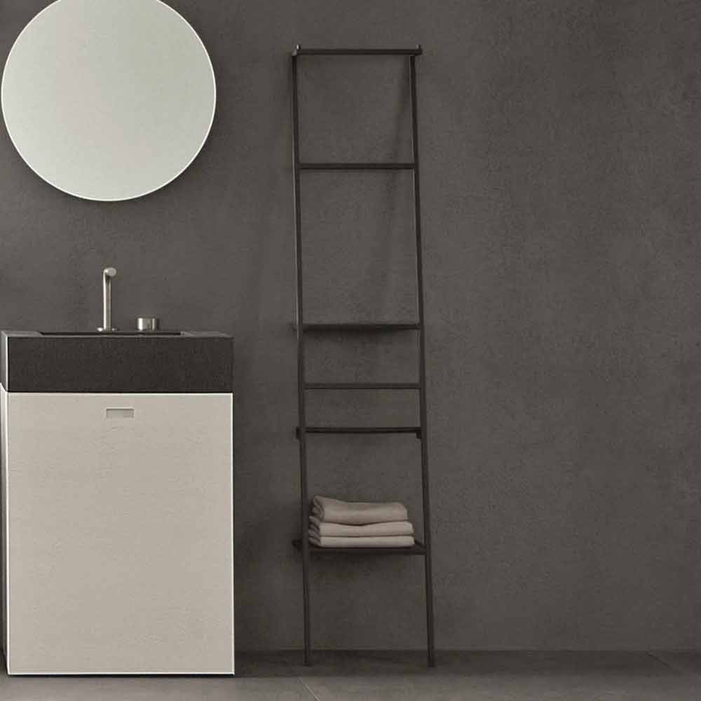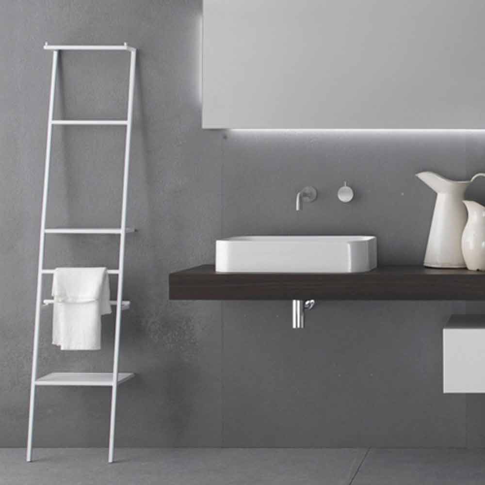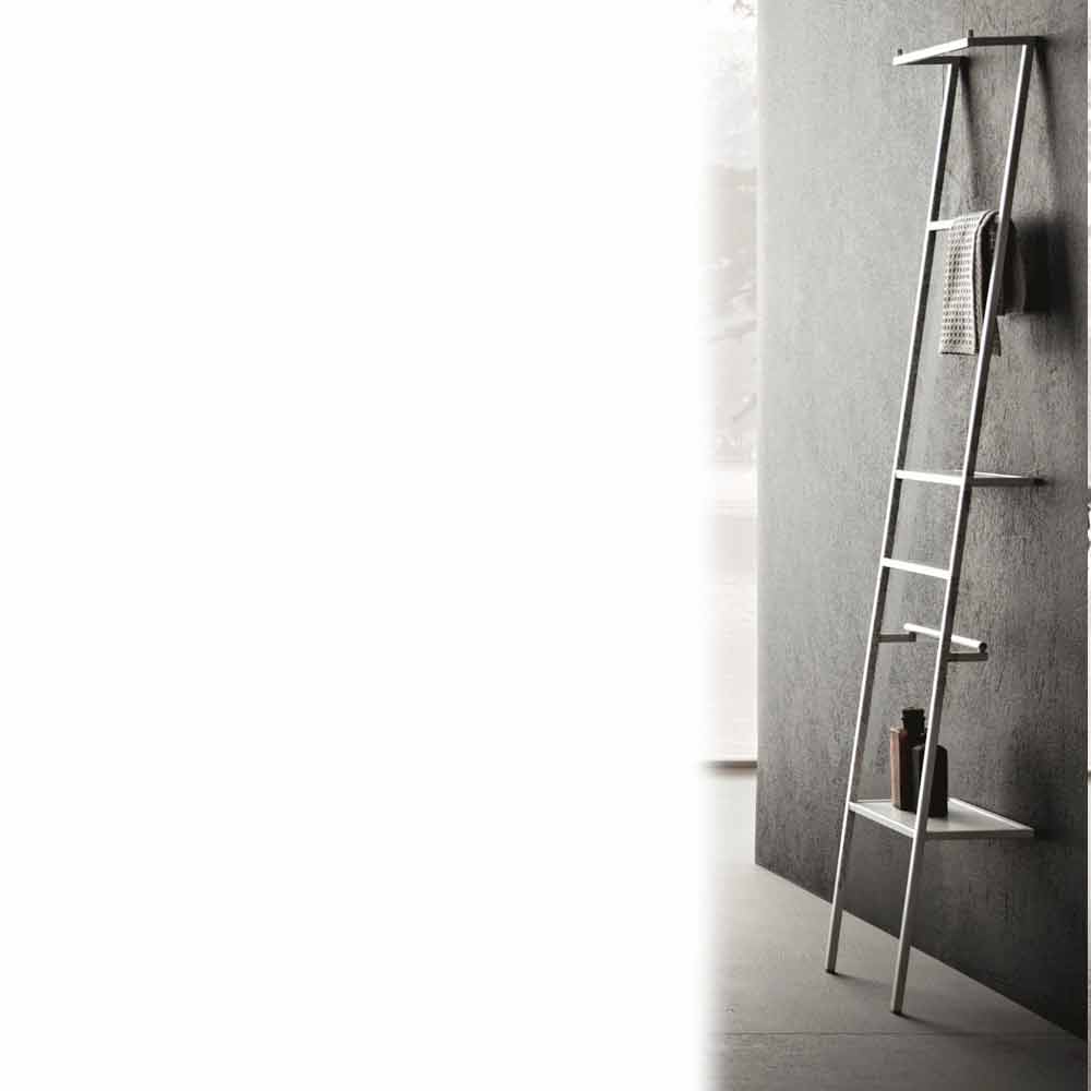 Hängeleiter aus matt lackiertem Metall mit minimalem und äußerst funktionalem Design. Es ist mit Regalen, Haken für Bademäntel, Überrollbügeln und Handtuchhaltern ausgestattet. Erhältlich in mattem Weiß oder anderen matten Farben.