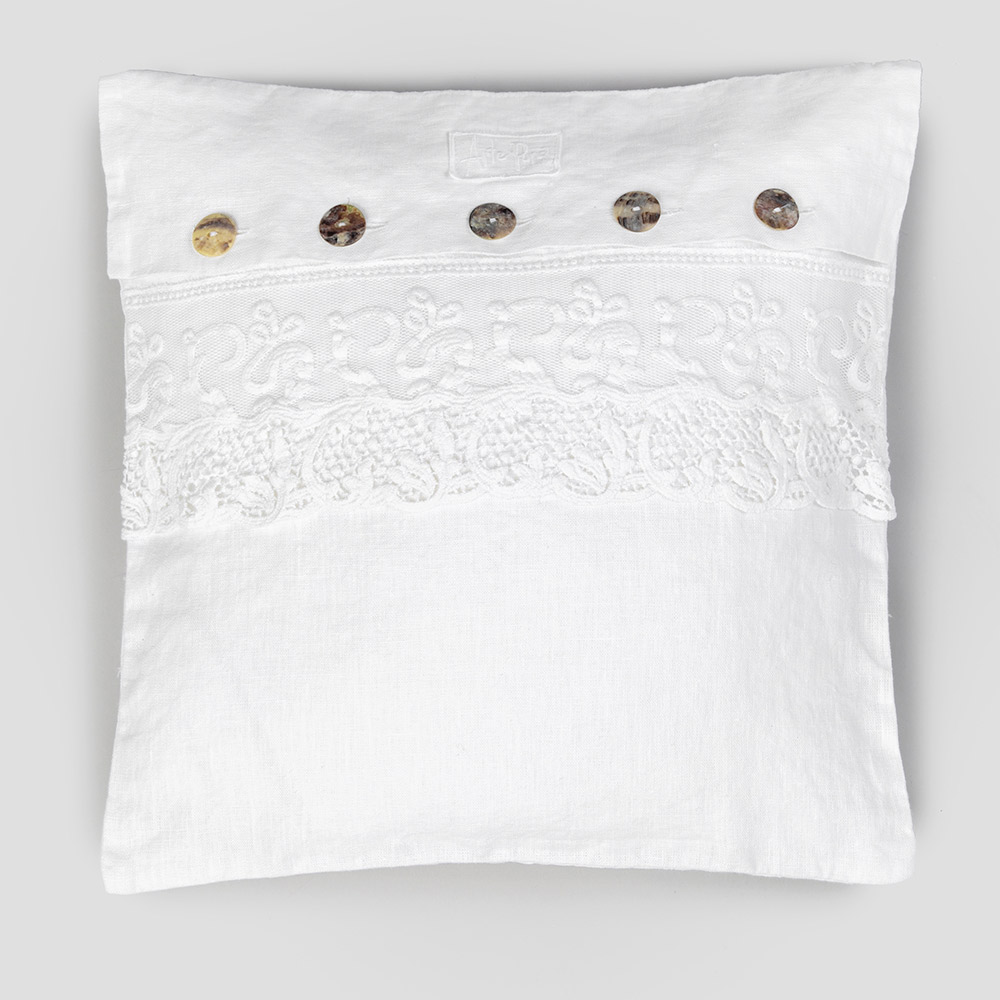 Quadratischer Kissenbezug aus reinweißem Leinen mit farnischer Spitze oder Tüll und Knöpfen, luxuriöses Design in Italien.