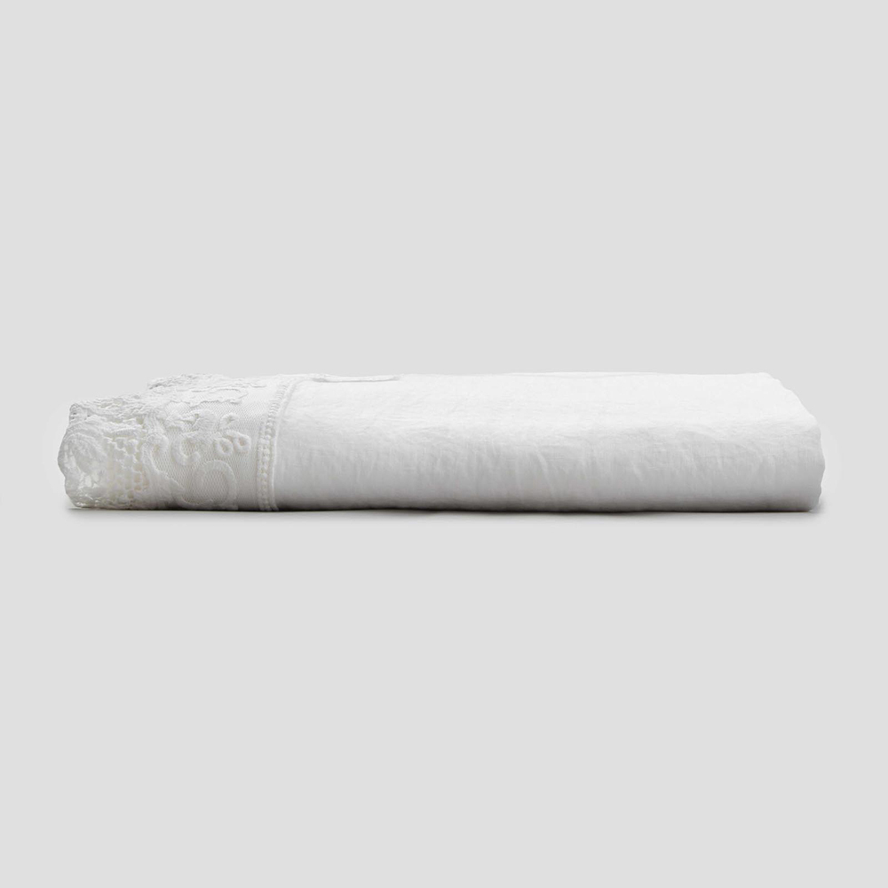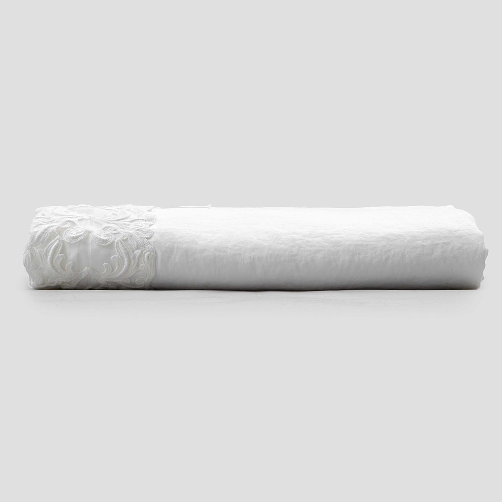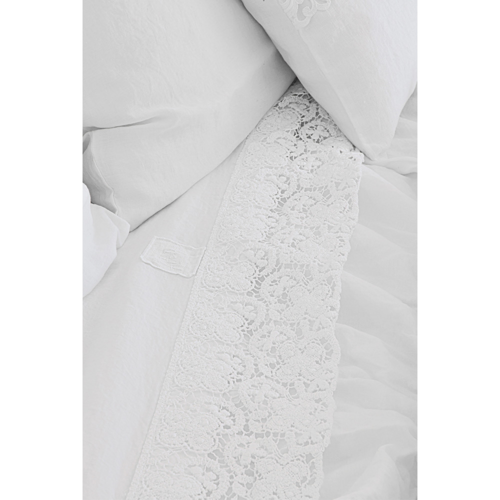 Bettlaken aus reinweißem Leinen mit verschiedenen Spitzen, luxuriöses Design, hergestellt in Italien.