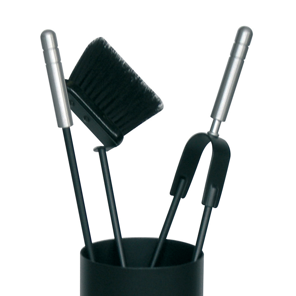 Werkzeughalter aus schwarzem Metall , vollständig in Italien hergestellt. Der Werkzeughalter enthält drei wichtige Kaminpflegezubehörteile : eine Klammer, eine Kehrschaufel und eine Bürste .
