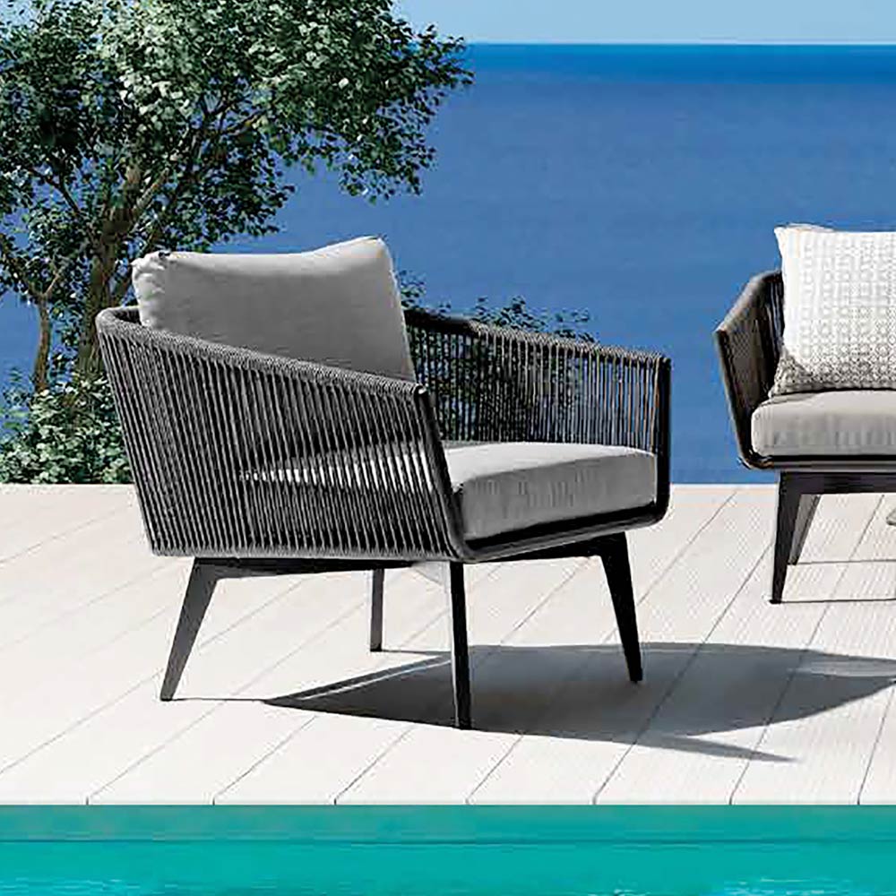 2 Sessel mit anthrazit lackierter Aluminiumstruktur, Seilrückenlehnen und grauen Outdoor-Stoffkissen.